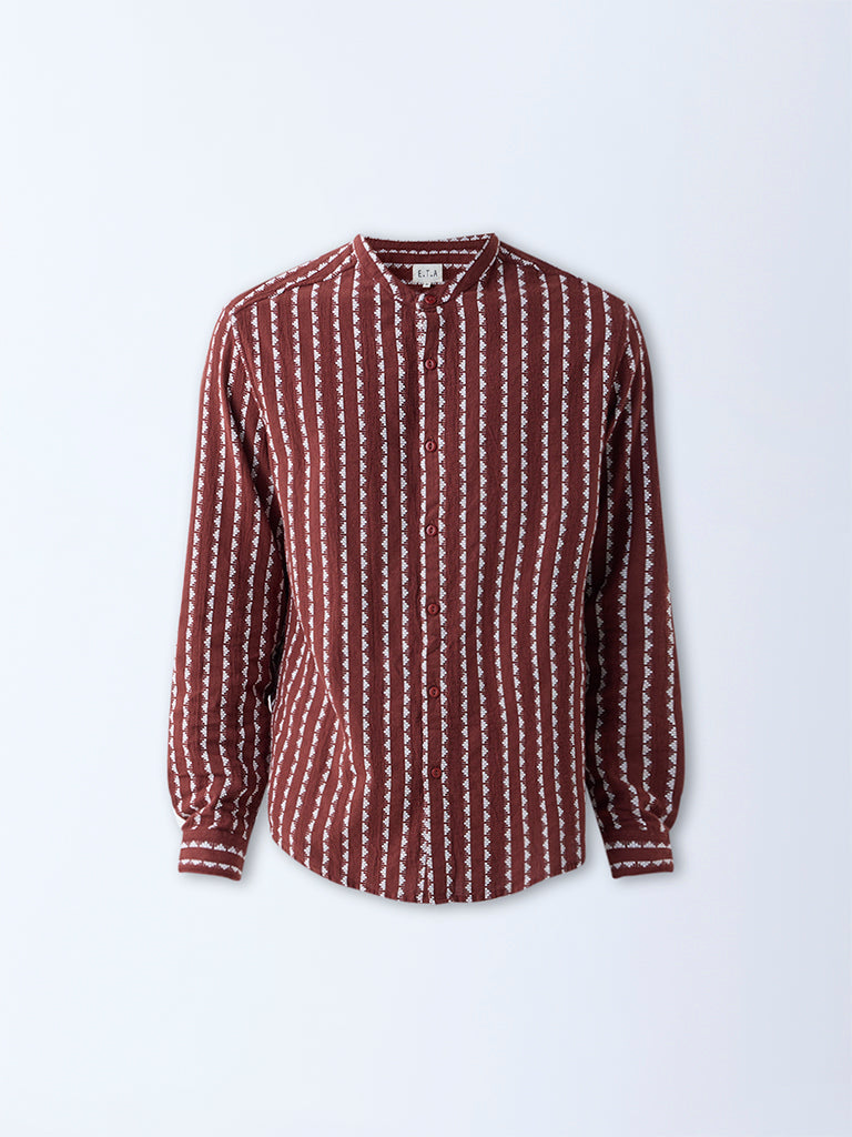 Effortlessly refined, this brown resort-fit shirt from ETA is designed for the modern man’s off-duty moments. Spun from pure cotton, it’s detailed with embroidery that adds subtle texture. The band collar, full sleeves, and clean button placket strike the right balance between laid-back and polished.