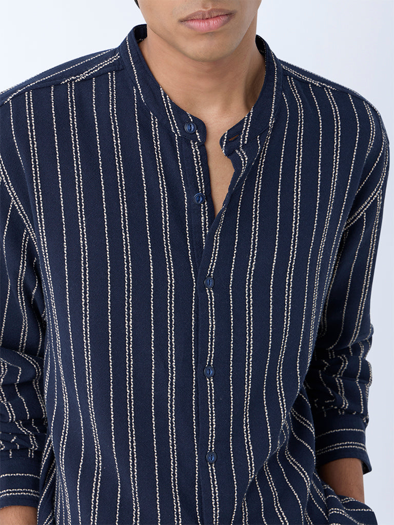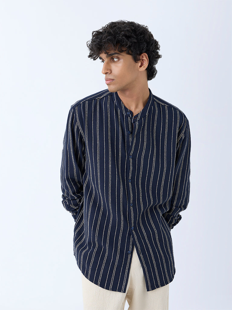 This navy shirt from ETA is detailed with embroidered stripes that add depth without overwhelming the look. Created from a breathable fabric, it features a relaxed silhouette with full sleeves, a mandarin collar, and a button placket. A clean, modern option that works just as well for casual days as it does for low-key evenings.