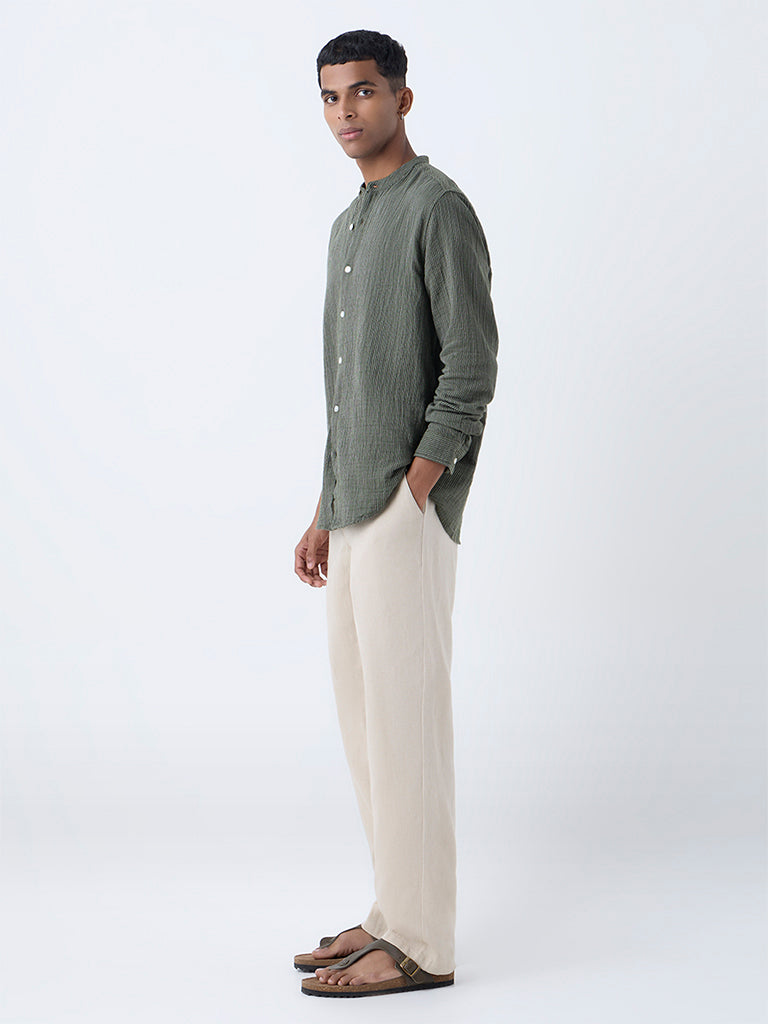 Keep it simple and stylish with this olive striped shirt from ETA. Made from breathable cotton in a relaxed frame, it features a band collar, button-down front, and full sleeves.