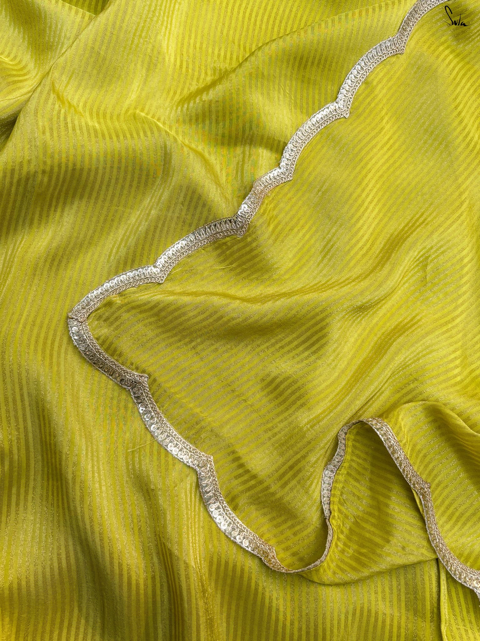 This looks straight out of a runway. A saree that feels like a burst of electric energy. The neon green hue commands attention. Viscose zari flickers with vibrant, metallic brilliance. Zari stripes spark with dynamic movement across the fabric. Scalloped lace embroidery adds a touch of intricate artistry to the bold palette.