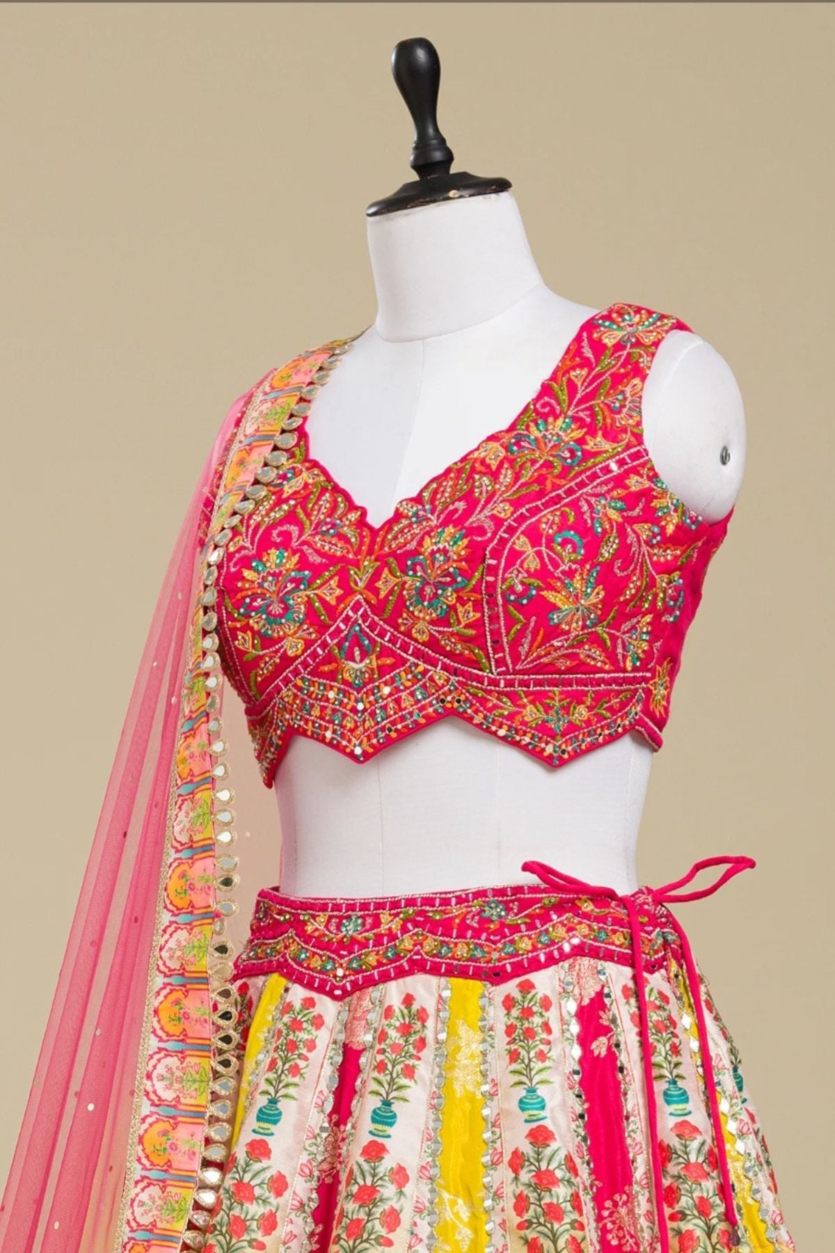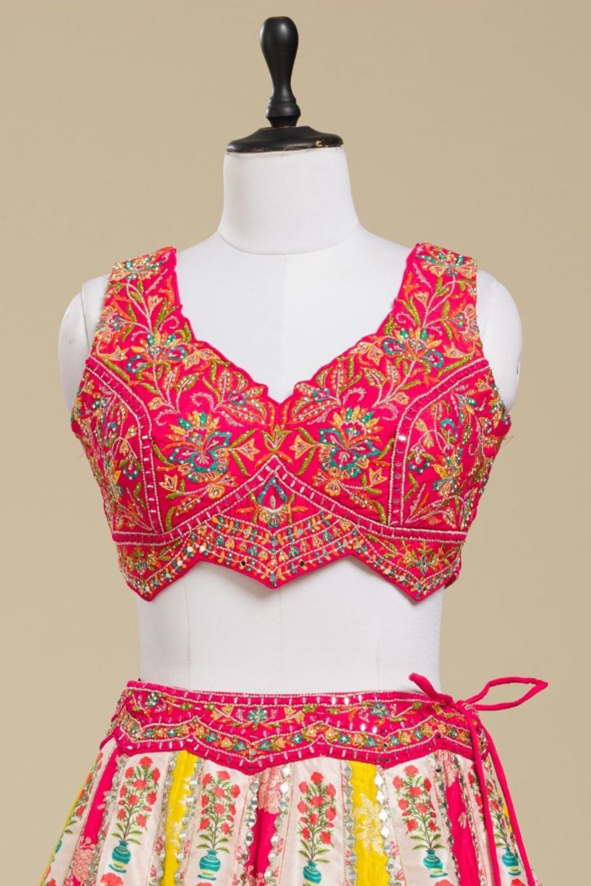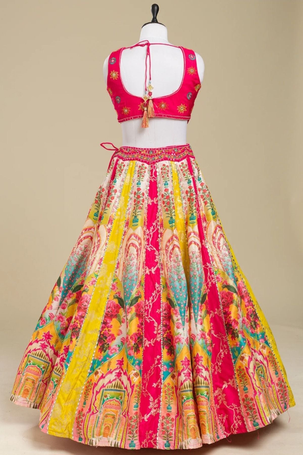 Step into a world of timeless charm with our Floral Traditional Silk Lehenga. Crafted from premium silk, this lehenga showcases a vibrant burst of colors adorned with intricate floral patterns, reflecting the richness of traditional artistry.