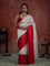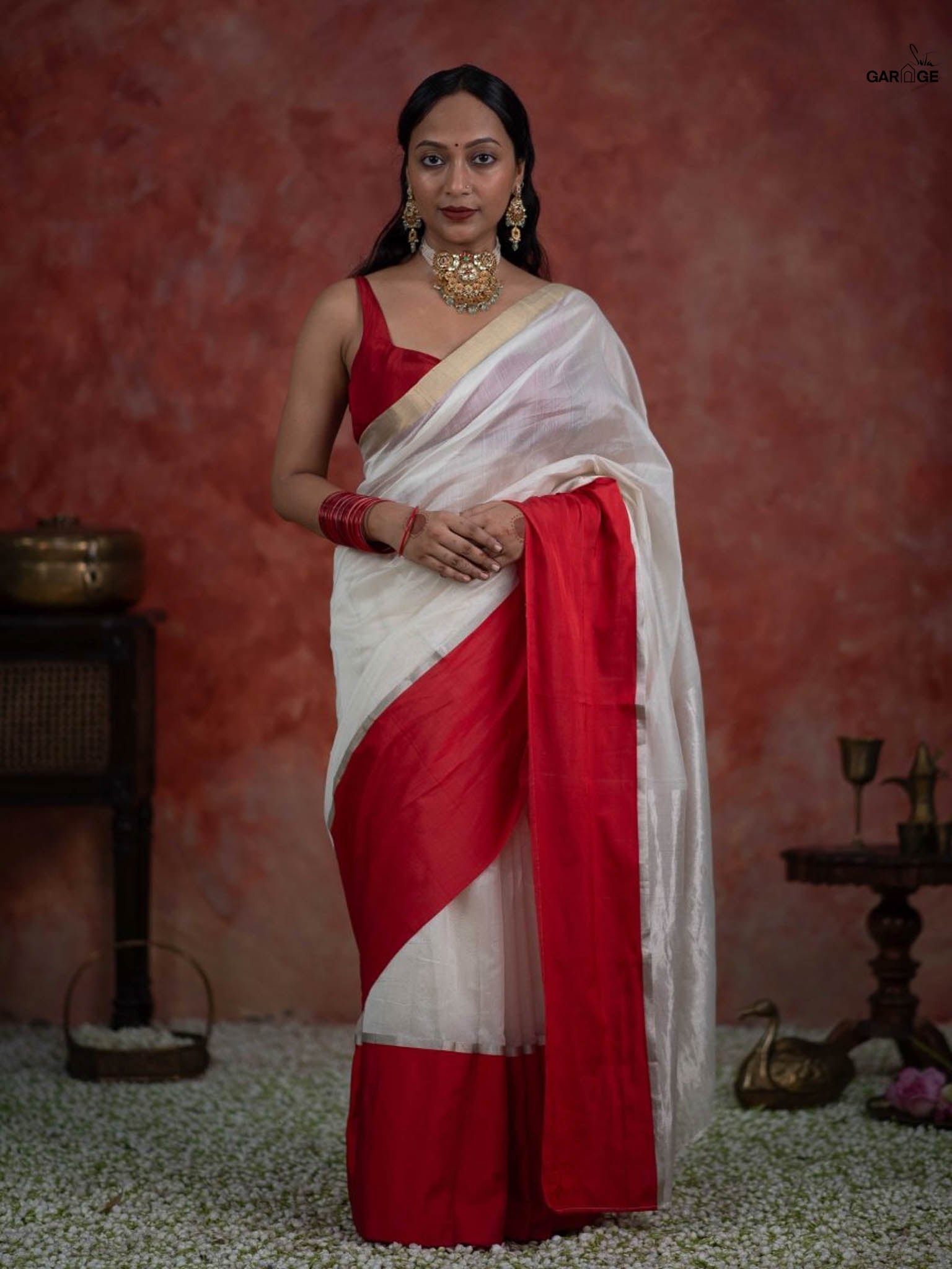 This saree has been handwoven by a master weaver in the Mashru tradition. The Mashru weave is said to have originated in West Asia, in the 19th Century. The fabric is woven with a silk weft and a fine cotton warp. It thus combines the ageless comfort of cotton and the timeless aesthetic of silk, elevated by the presence of gold and silver zari.