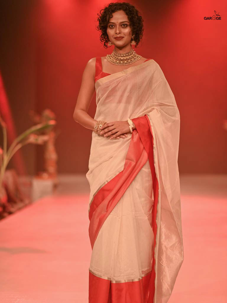 This saree has been handwoven by a master weaver in the Mashru tradition. The Mashru weave is said to have originated in West Asia, in the 19th Century. The fabric is woven with a silk weft and a fine cotton warp. It thus combines the ageless comfort of cotton and the timeless aesthetic of silk, elevated by the presence of gold and silver zari.