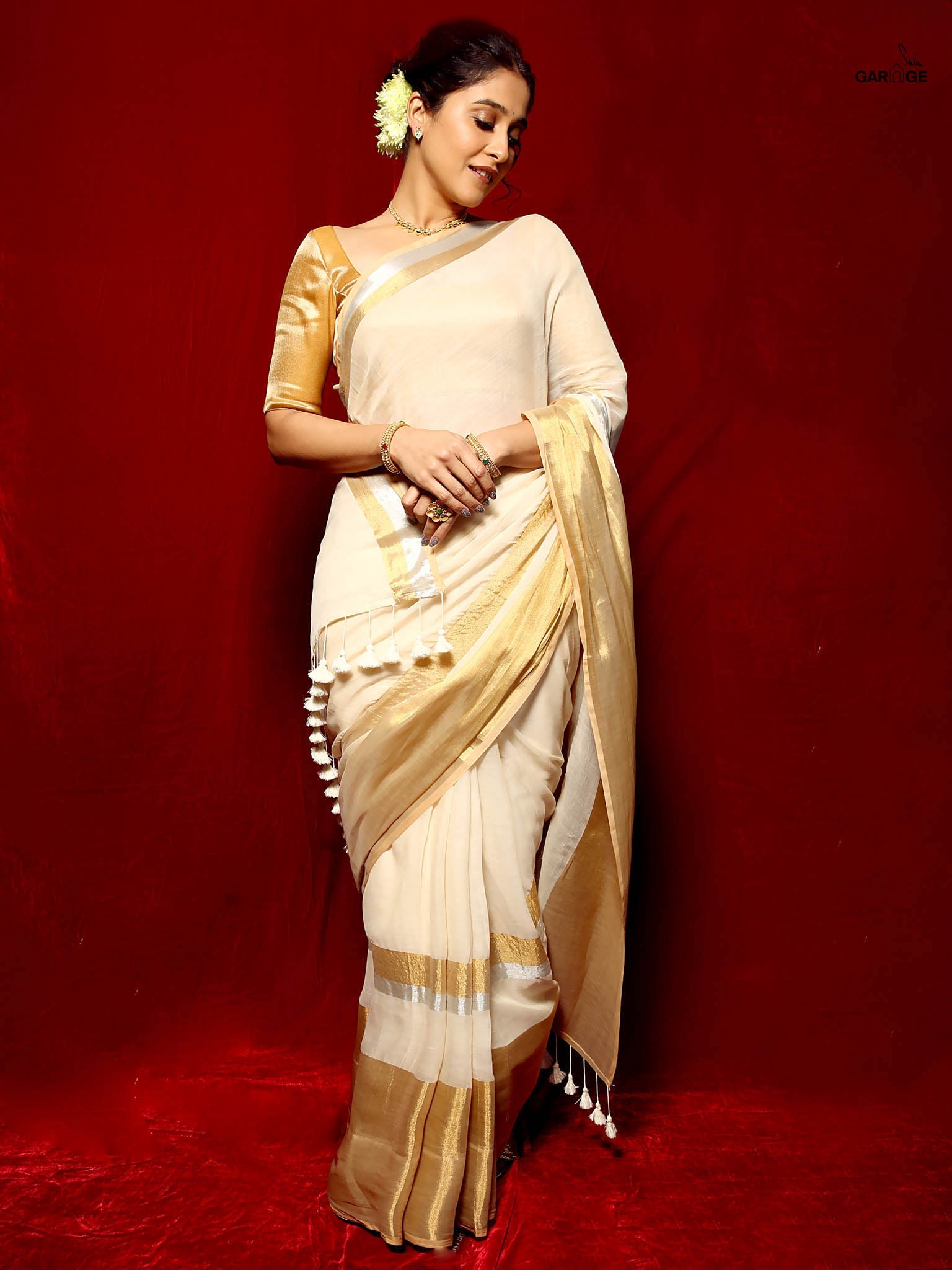 Our ˜made in heaven mul cotton, is also known as mul mul in West Bengal. The fabric is buttery soft and has a delicate beauty. Its weave is very fine and this lends a very fluid texture to the fabric, which makes draping it a breeze. It truly is like a hug that wraps you in its love. The addition of zari adds a regal sheen to this saree, making it as beautiful as it is comfortable.