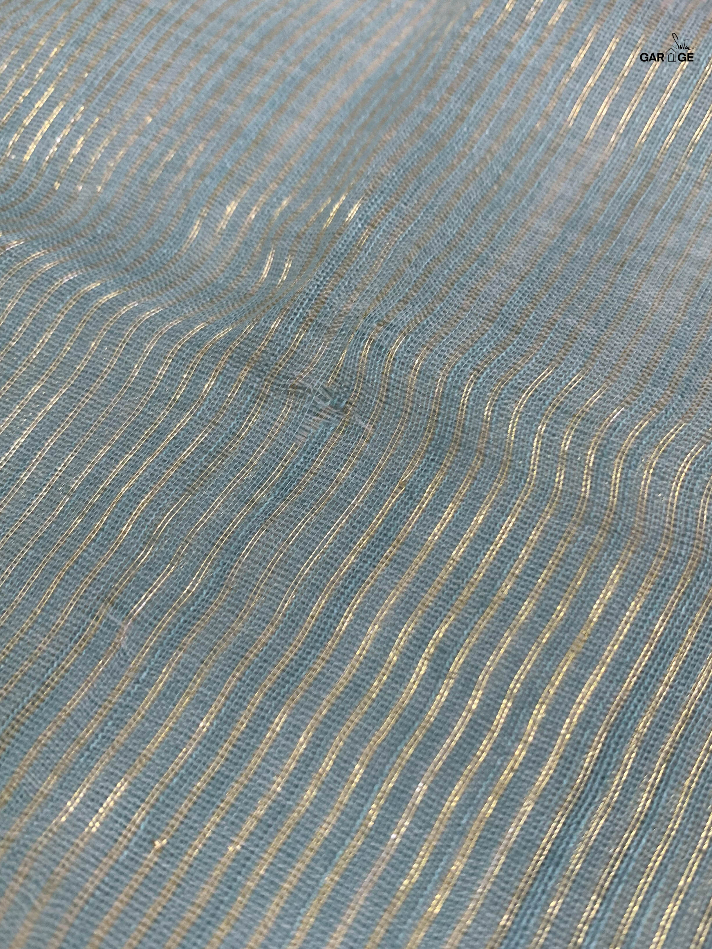 Imagine styling yourself in the mesmerizing Aasmani Mehfil Saree in light blue, crafted with a cotton slub fabric that’s lightweight yet rich. Perfect for celebrations, this festive saree features a red and gold border with intricate zari details and zari stripes throughout the saree.