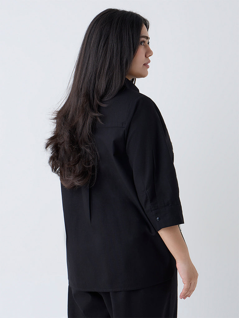 This black shirt from Gia blends everyday ease with considered detailing. The premium lightweight fabric is elevated with floral embroidery on the front, adding texture without overwhelming the look. Designed with a classic collar, concealed button placket, and three-quarter sleeves, it delivers a chic, contemporary vibe that flatters with ease.