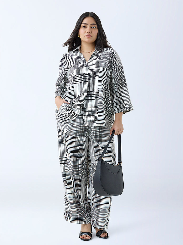 This black shirt from Gia stands out with its modern take on checkered prints, offering a graphic edge to everyday styling. Spun from an ultra-lightweight fabric, it features a shirt collar, a concealed button placket, and three-quarter sleeves for a streamlined finish.