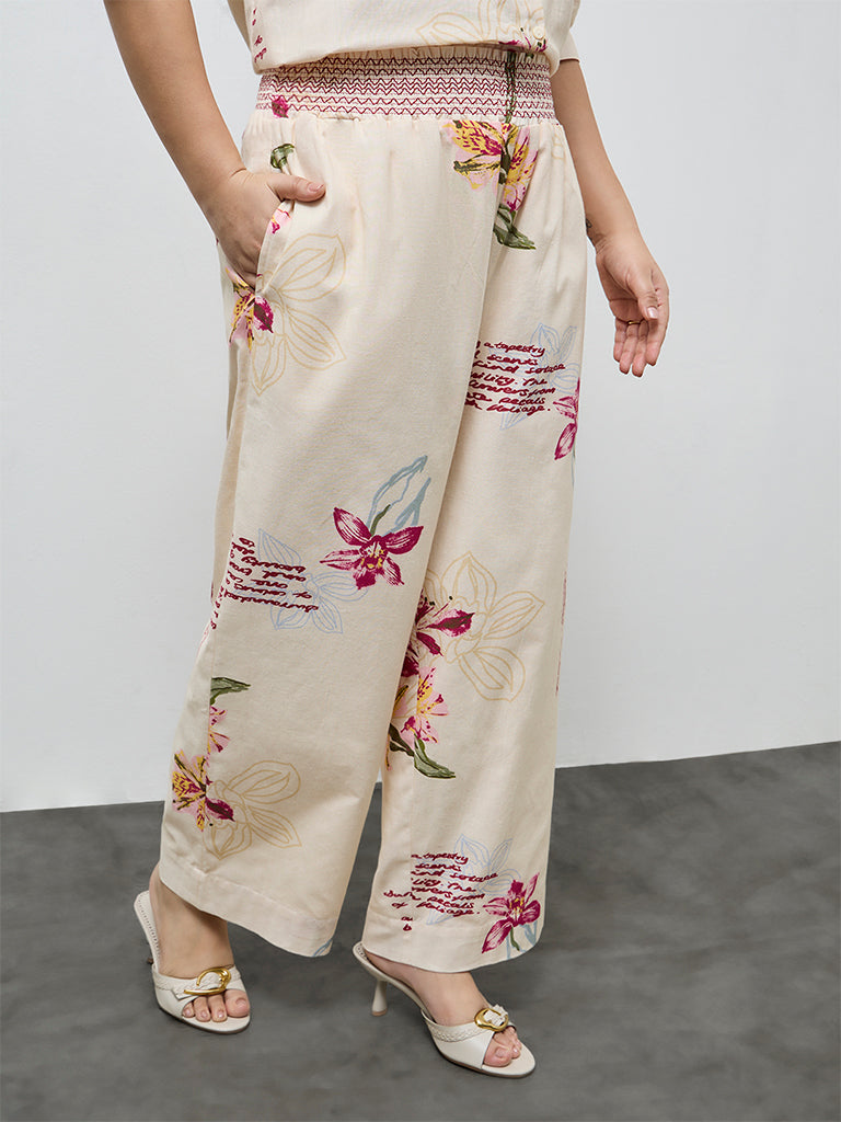 Refresh your wardrobe with these cream trousers from Gia, patterned with delicate floral motifs throughout. Crafted from a cotton-blend fabric, they balance softness with structure. The smocked waistband ensures a comfortable fit, while side pockets add everyday functionality.