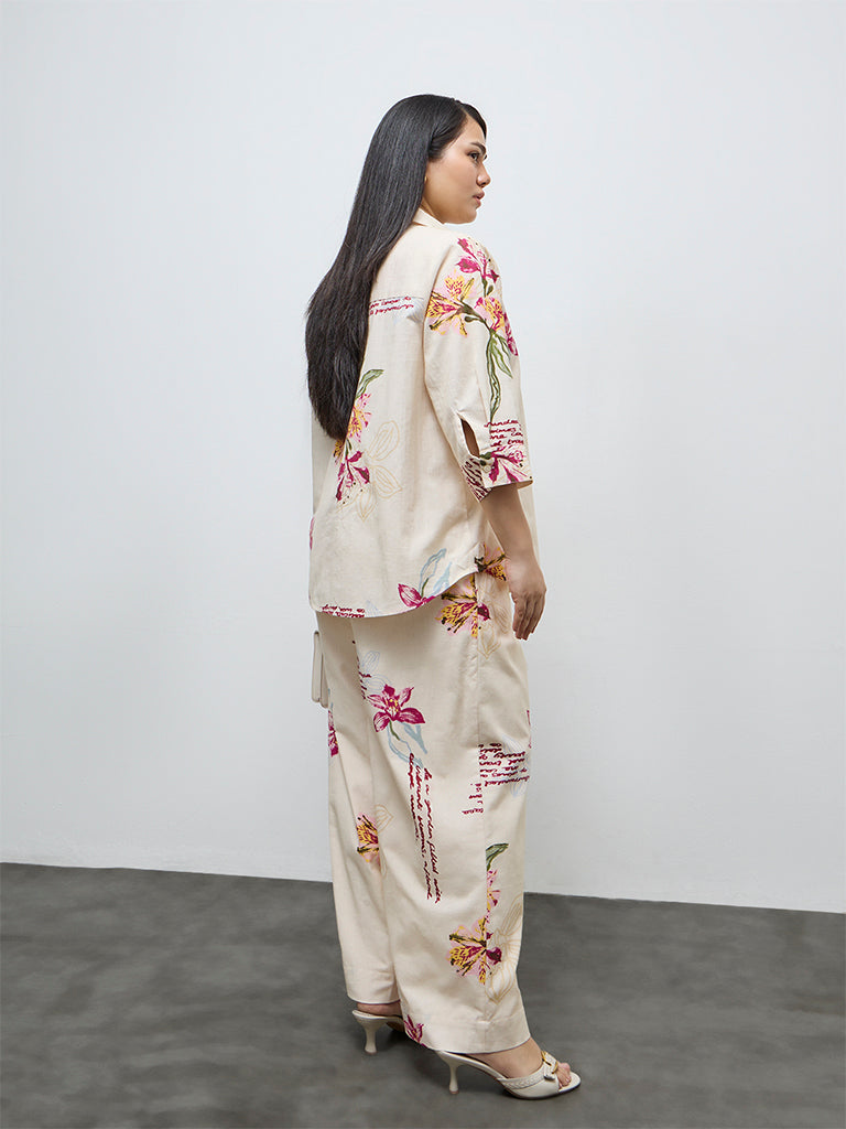 Gia Cream Floral Design High-Rise Cotton-Blend Trousers