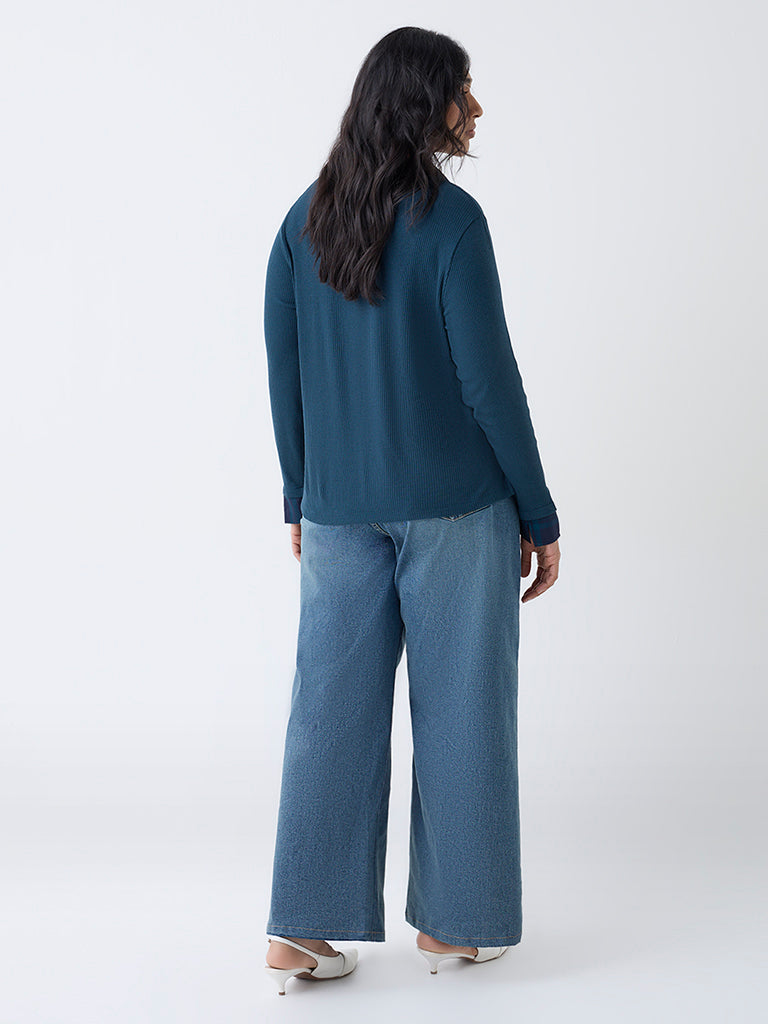 Gia elevates everyday dressing with this dark teal top featuring a refined ribbed texture. Designed with a V-neck and full sleeves, it includes a contrasting collar that adds a sharp accent. Woven from premium-blend fabric, it delivers structure and comfort in equal measure.