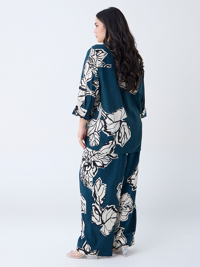 Teal trousers by Gia crafted with subtle foliage motifs that bring visual interest while elongating the frame. Designed in a breathable fabric with a gentle drape, they feature an elasticated waistband for a contoured yet comfortable fit. Side pockets ensure everyday ease, making them a stylish essential for polished weekday dressing or relaxed weekend looks.