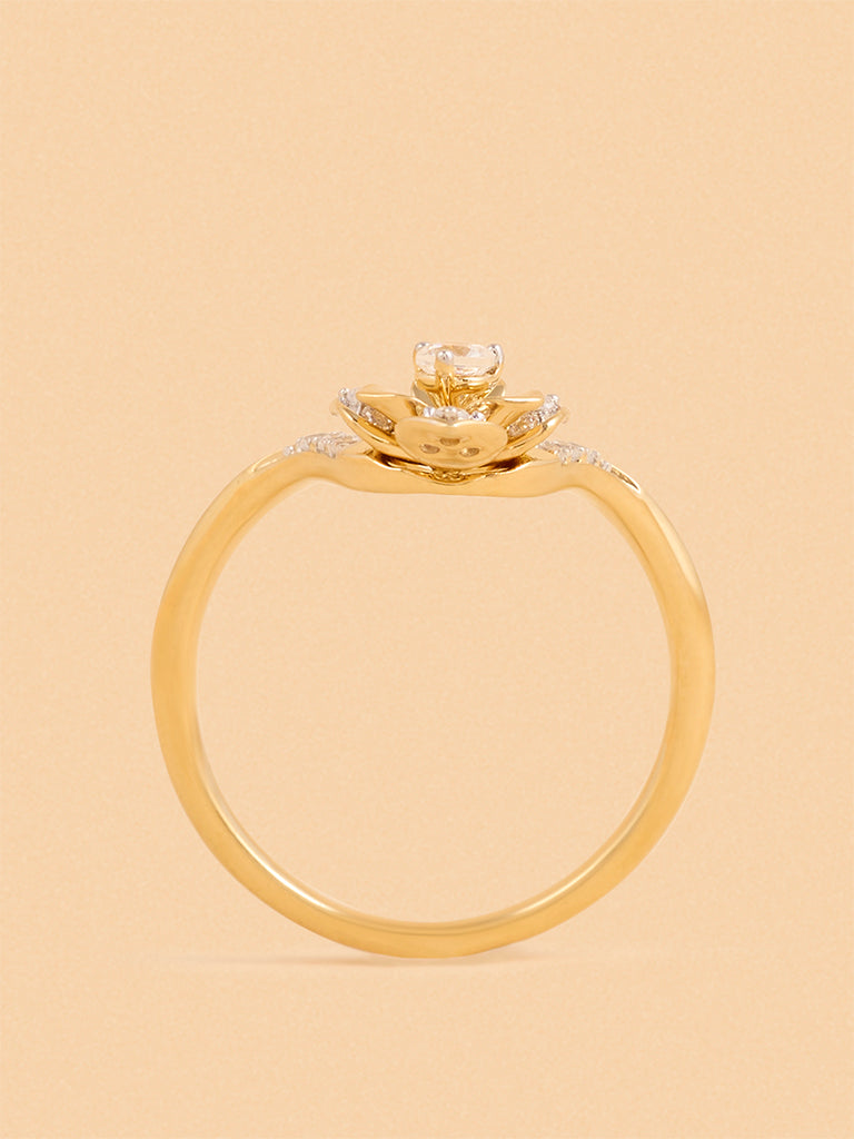Westside X Pome presents this gold multilayer rose V ring, designed with a polished gold-tone band that elegantly splits into a V-shape design, adorned with clear stones. At the center, a layered rose motif is accented with additional clear stones, enhancing its intricate detailing and charm.
