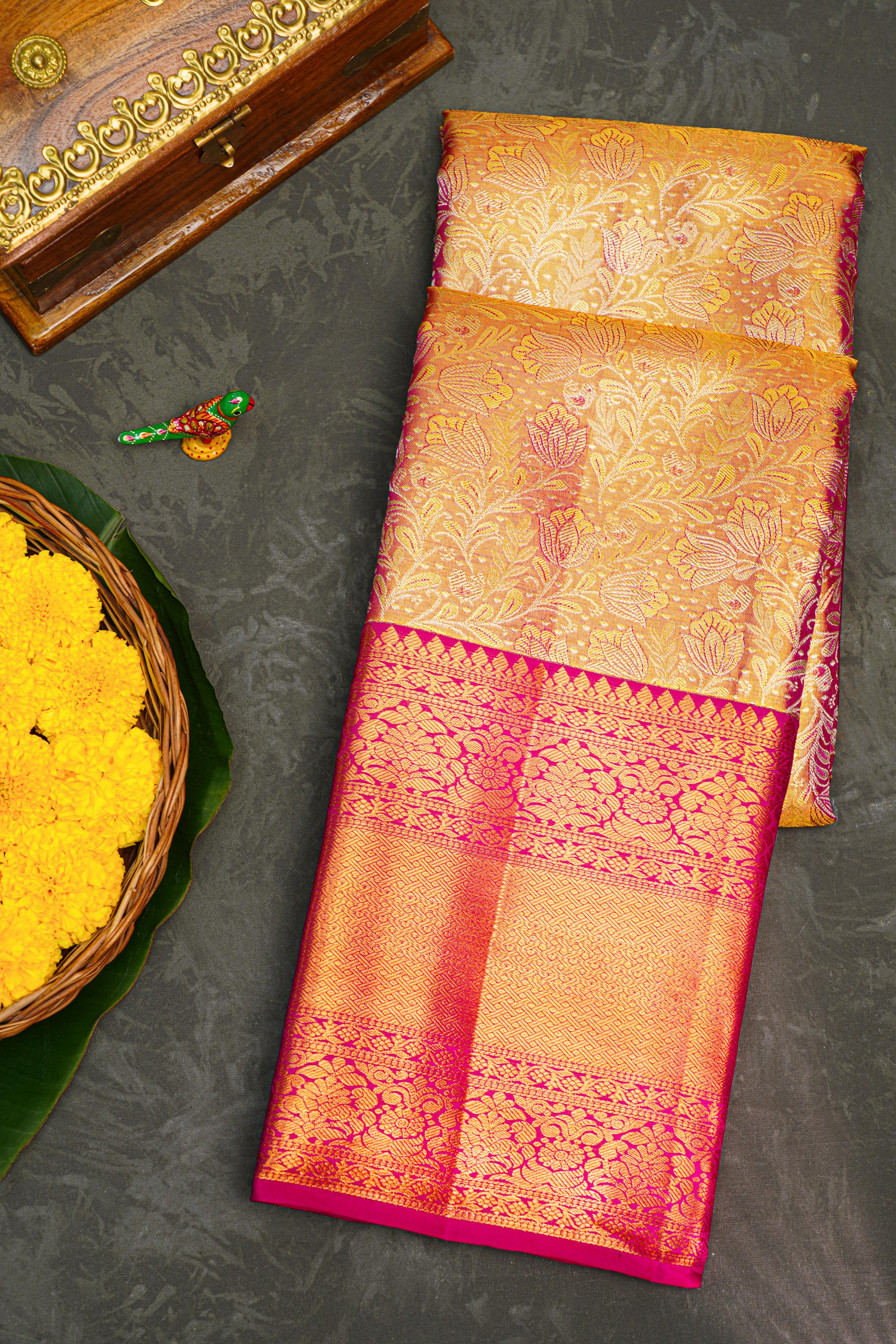 GOLD PINK and PINK FLORAL JAAL SILK Saree with KANCHIPURAM