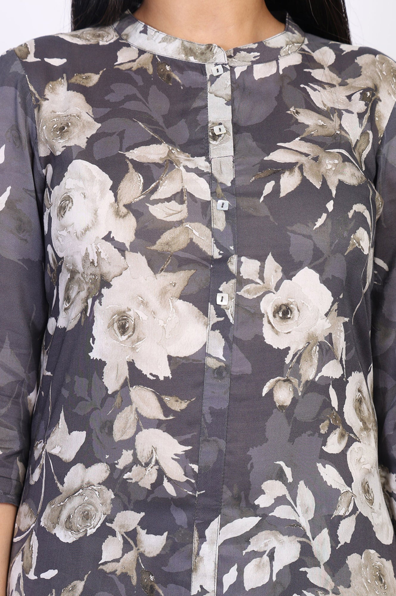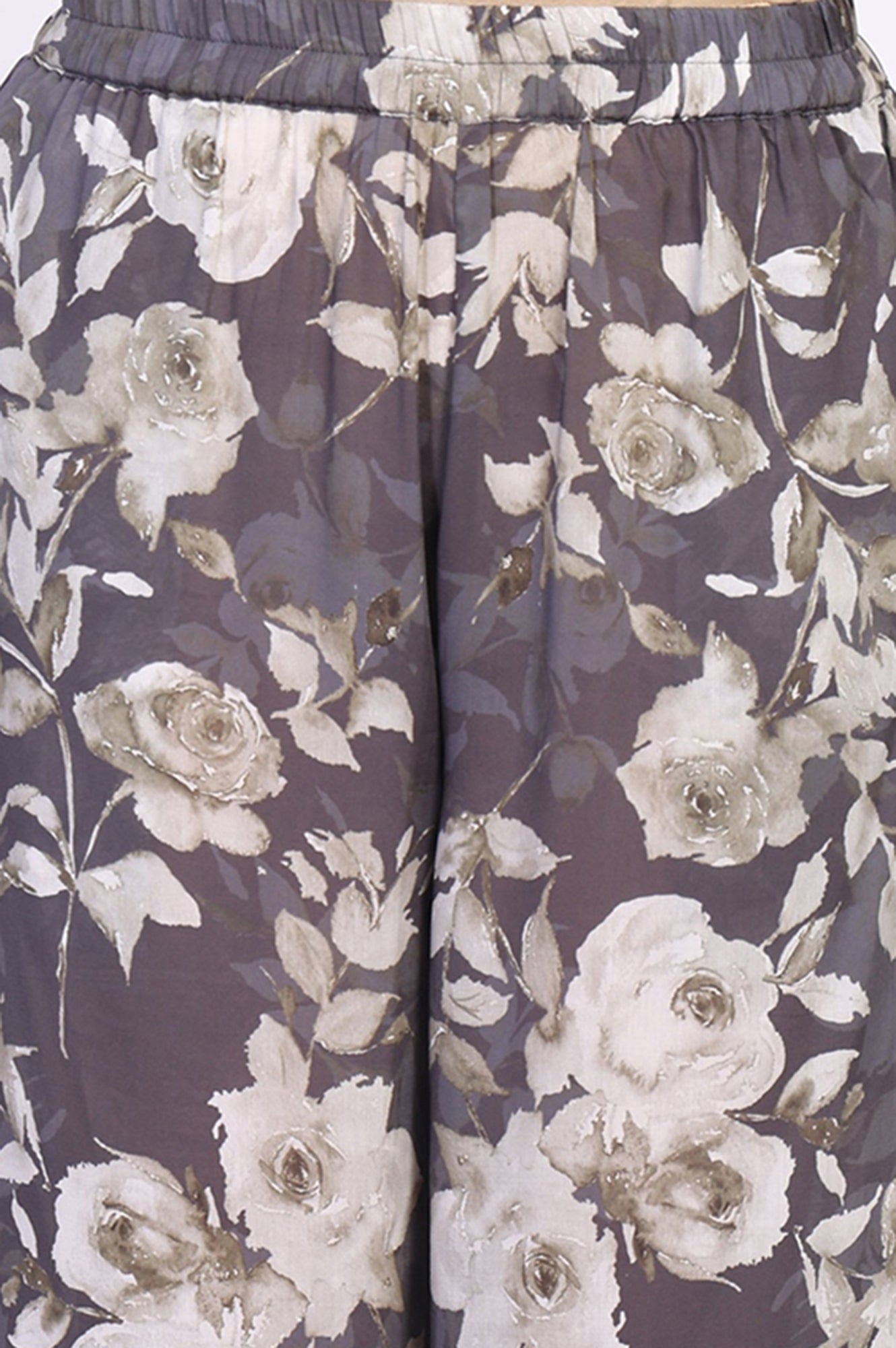 Effortlessly chic! This grey floral printed kurta set for women is crafted from a breathable cotton blend fabric, featuring a straight silhouette with side slits for ease of movement. The band collar and three-quarter sleeves add a modern touch, while the elasticated waistband ensures comfort. Perfect for casual outings, this set includes a knee-length kurta and relaxed-fit salwar, both adorned with an all-over floral print. A versatile addition to your wardrobe, this ensemble is ideal for spring and summer days, offering a blend of style and comfort.