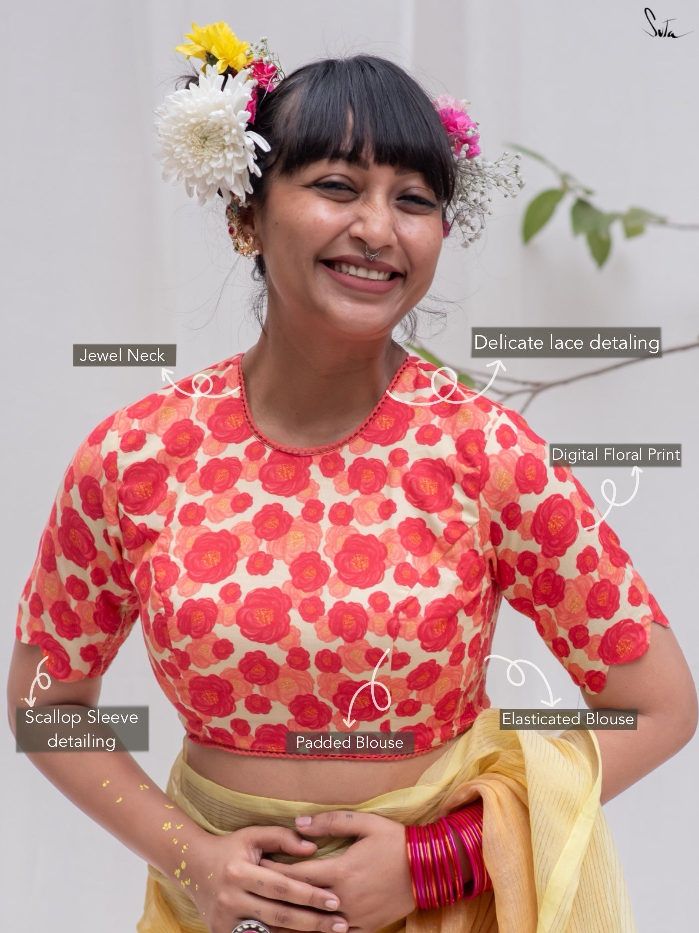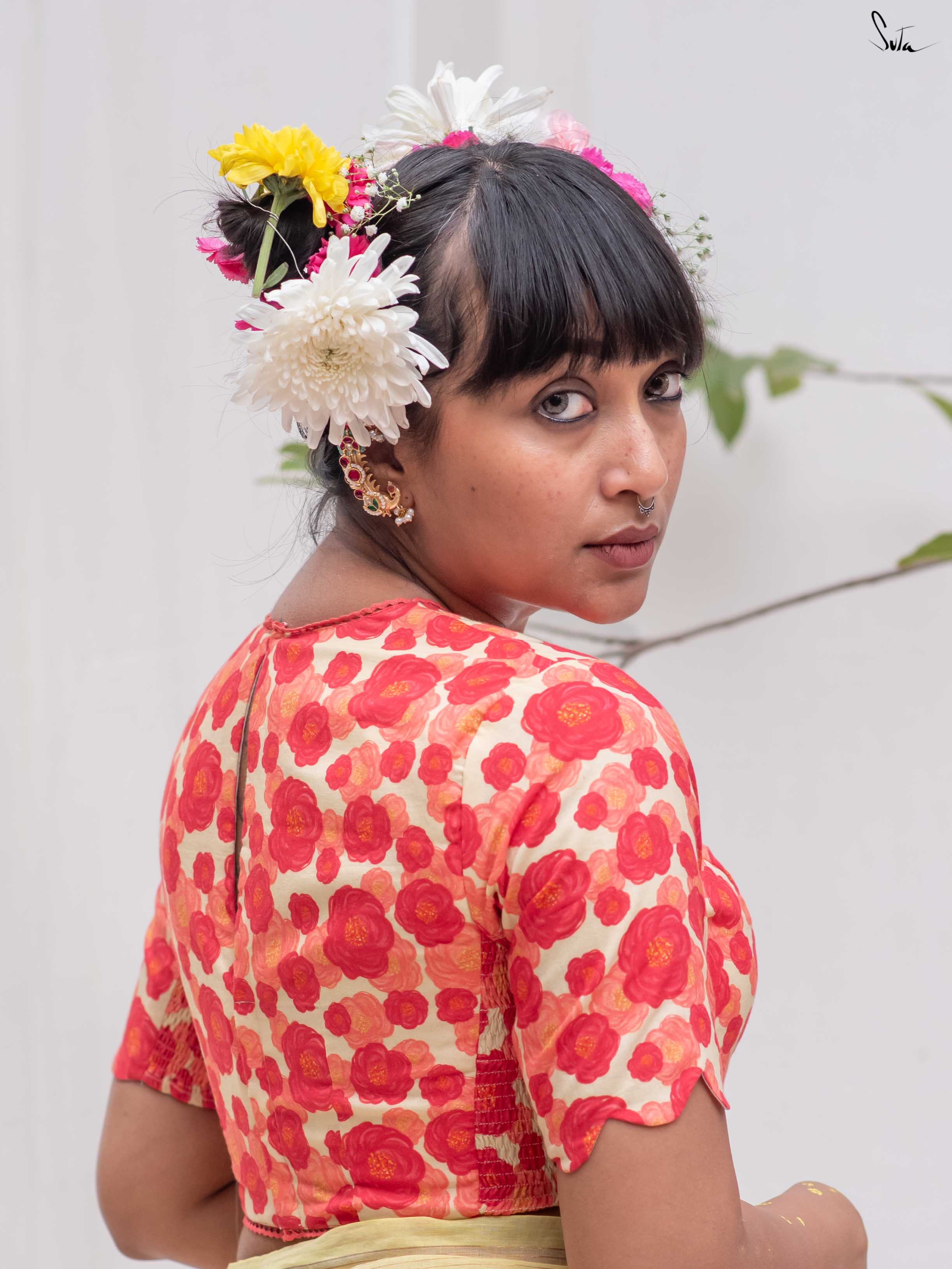Saree: Ta, the model is wearing a size S blouse and the saree called Sitara Sa Basant