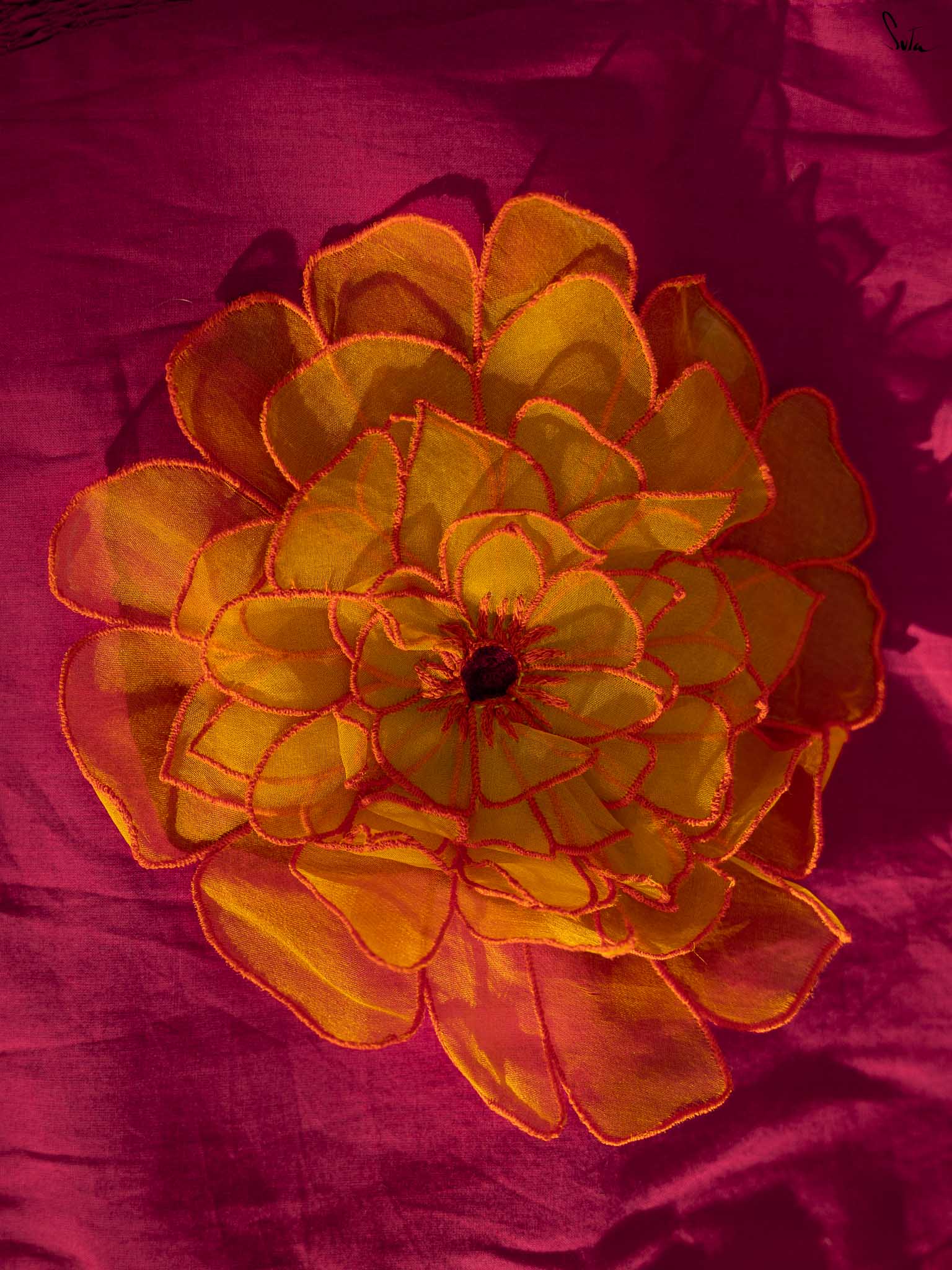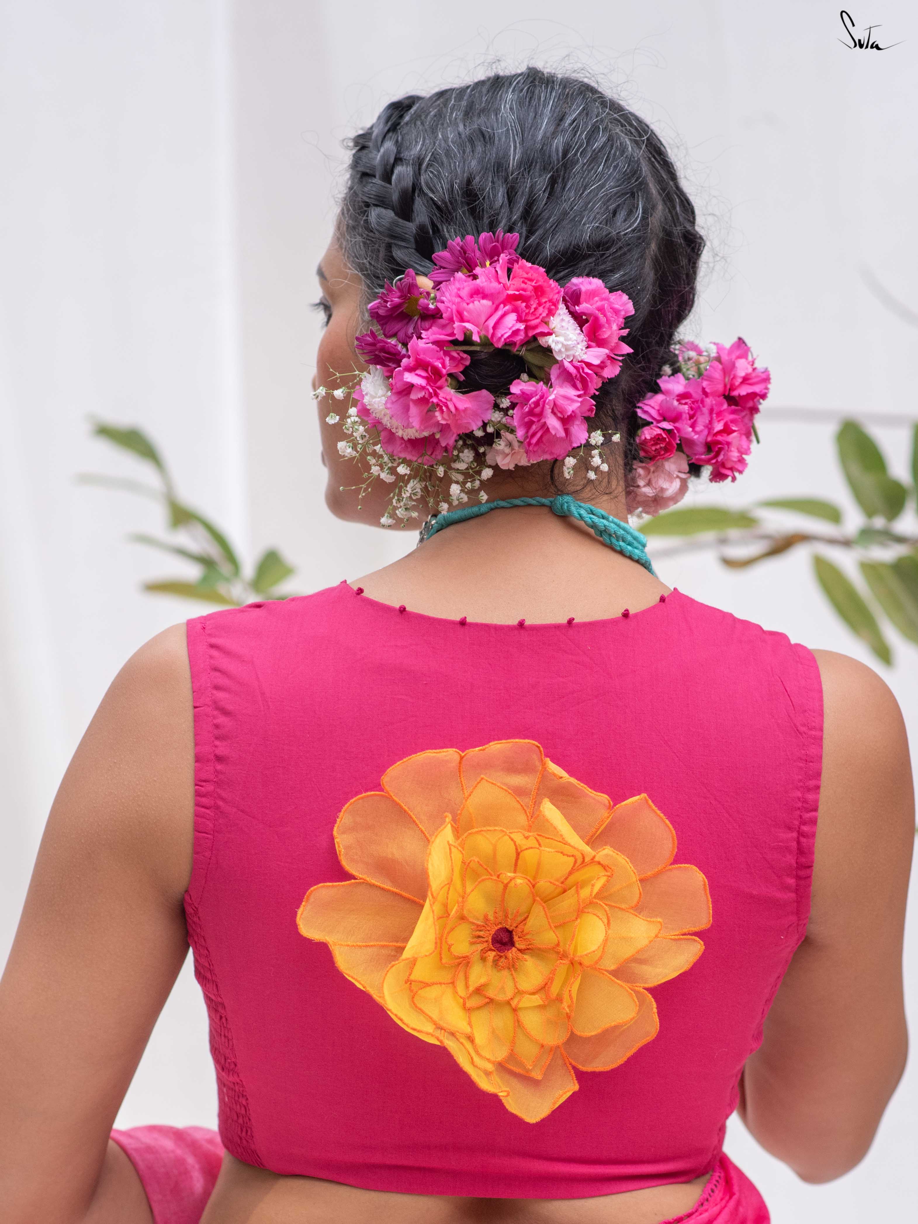 Sweet, feminine, and full of spring charm, this blouse stands out with a handcrafted marigold appliqué blooming softly at the back. The cotton cambric fabric keeps it light and breathable, while the U-neck, sleeveless silhouette, and side elastic ensure ease and comfort through the day.