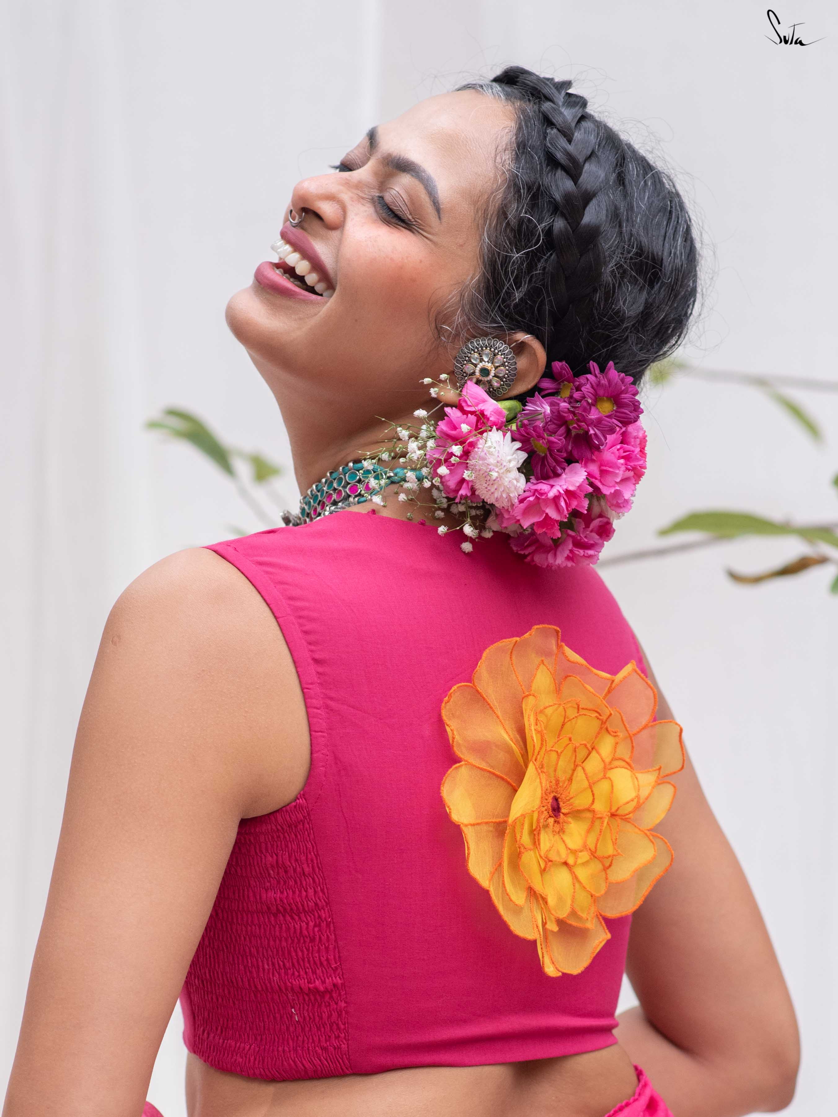 Saree: Su, the model is wearing a size S blouse and the saree called Genda Sa Basant