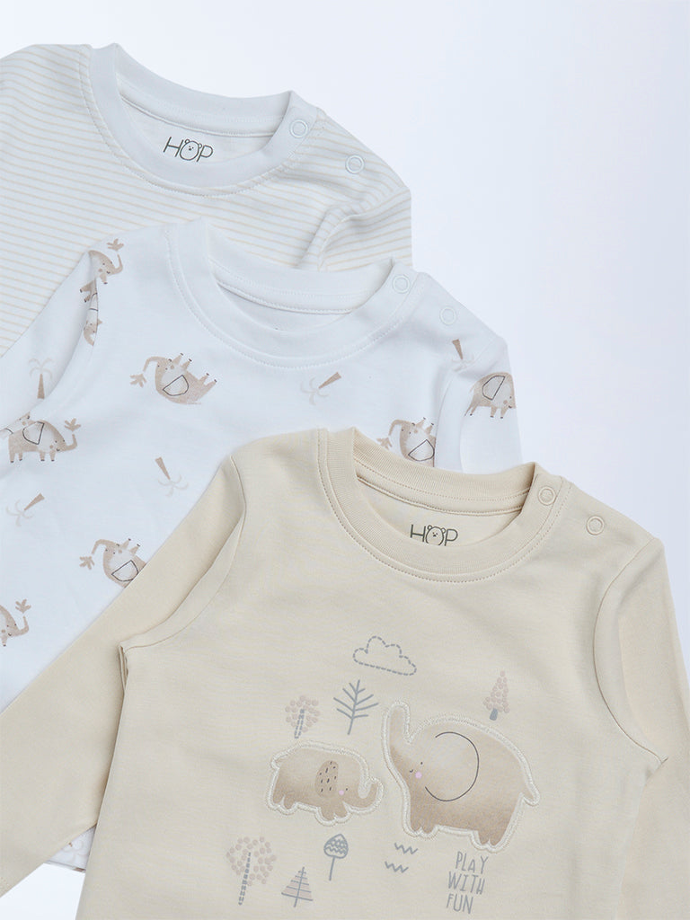 This pack of three t-shirts from HOP Baby is made from soft, breathable cotton to ensure all-day comfort. Featuring a mix of animal prints and stripes in calming beige, cream and off-white shades, these tees are finished with a crew neckline, full sleeves and snap-button shoulder closures for easy changes.