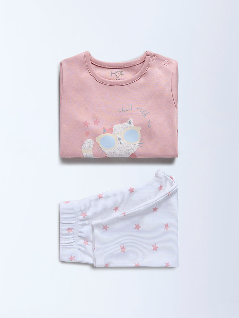 HOP Baby Dusty Pink Cat Printed Cotton T-Shirt and Pants Set - Exclusive