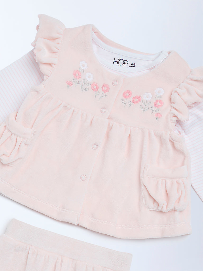 HOP Baby presents this pink set crafted for everyday comfort. The top features floral embroidery, ruffled details and a button placket. It is layered over a soft striped inner tee for added warmth. The coordinating pants come with an elasticated waist and cuffed hems to ensure a snug, easy fit. Made from a cotton-rich fabric, this set offers a gentle feel against the skin, perfect for playtime and cosy days at home.