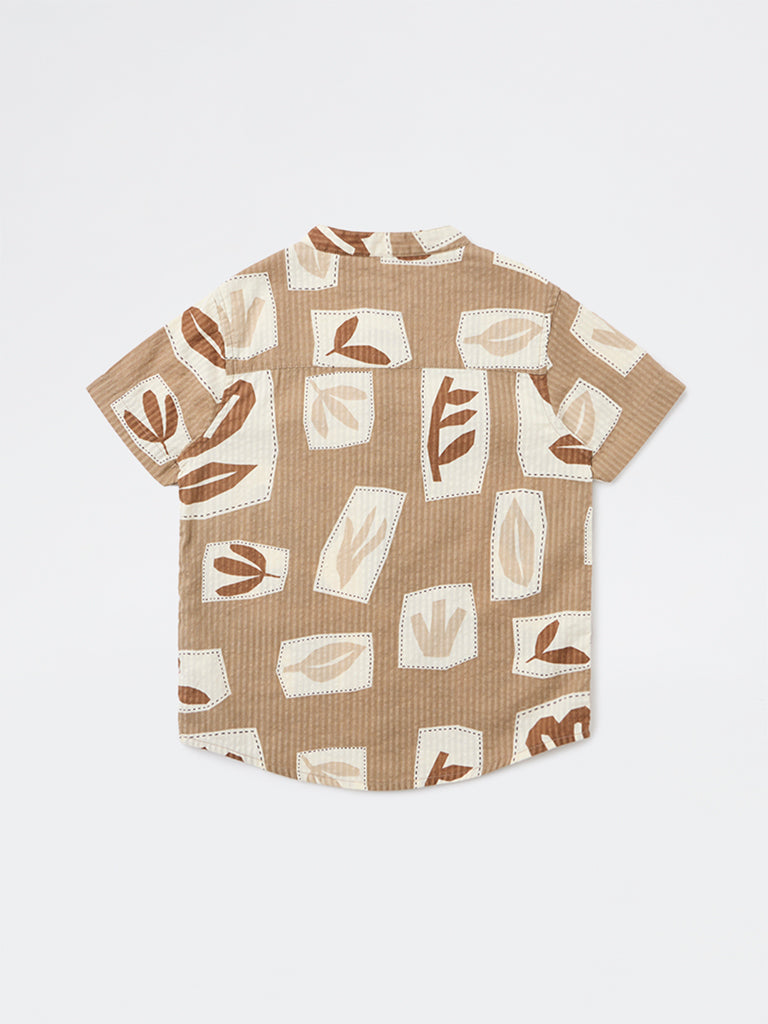 Quietly detailed and rich in texture, this taupe striped shirt from HOP Kids is crafted from textured cotton for a soft, comfortable feel. A band collar and button-up front frame delicate printed leaf motifs, adding a playful layer to the design.