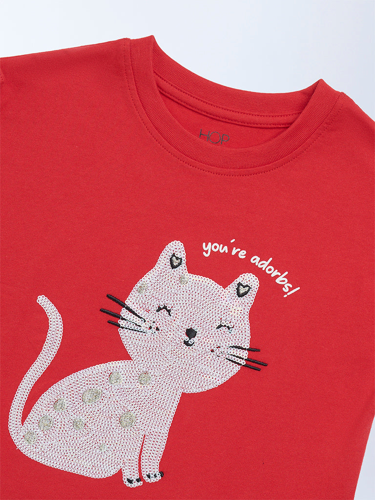 HOP Kids Girls Red Embellished Cotton T-Shirt