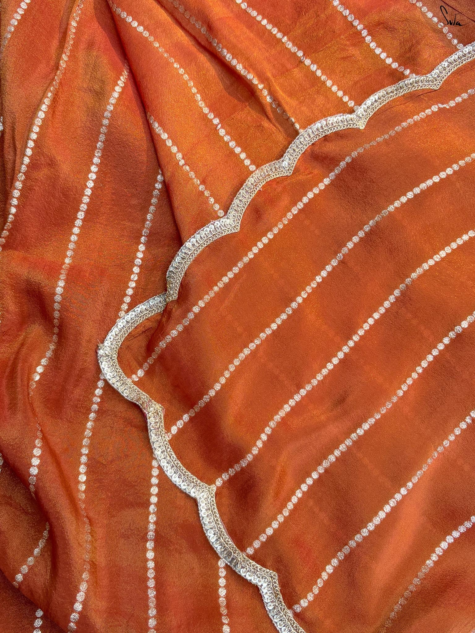 A saree that feels like autumn sunlight. The rust tone glows with warmth. Zari stripes add a touch of shimmer. The embroidered scallop lace softens the edges, adding grace to its earthy charm. It makes you feel grounded yet luminous.