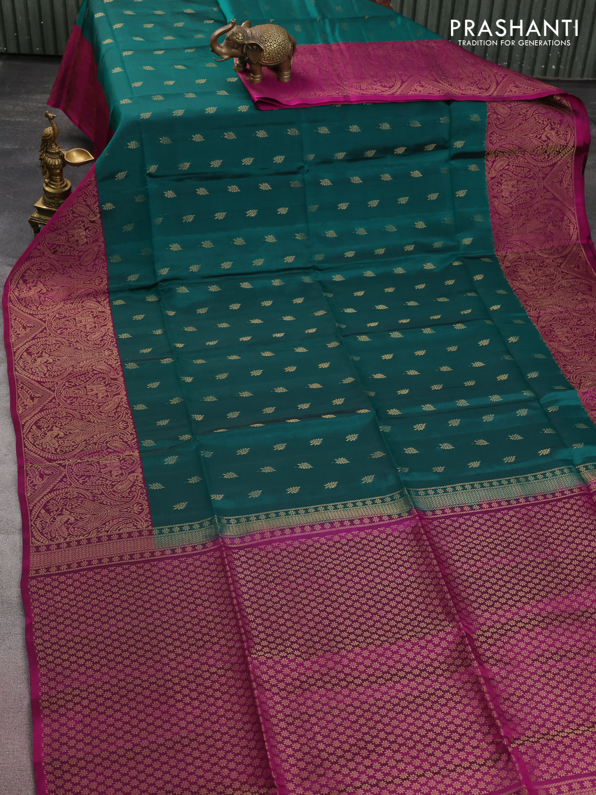 Kanchipuram soft silk saree peacock green and purple with allover zari woven buttas and long zari woven border