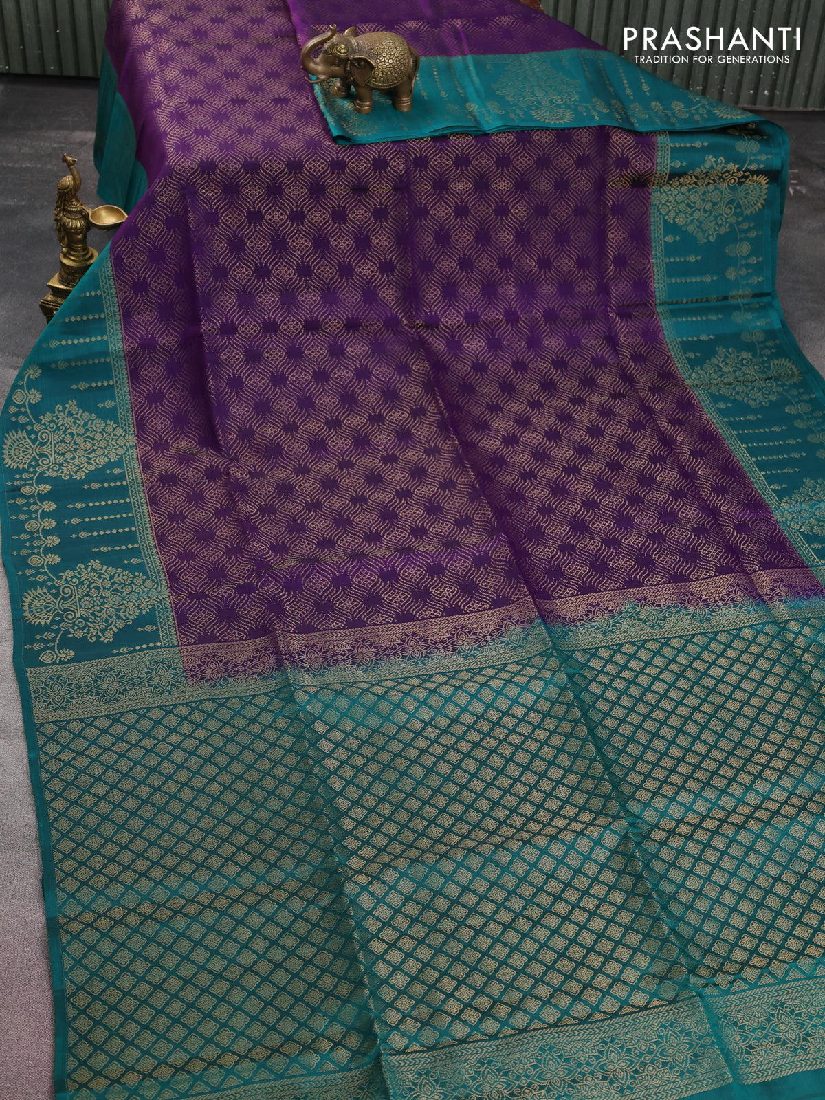 Kanchipuram soft silk saree violet and peacock green with allover zari woven brocade weaves and long rich zari woven border