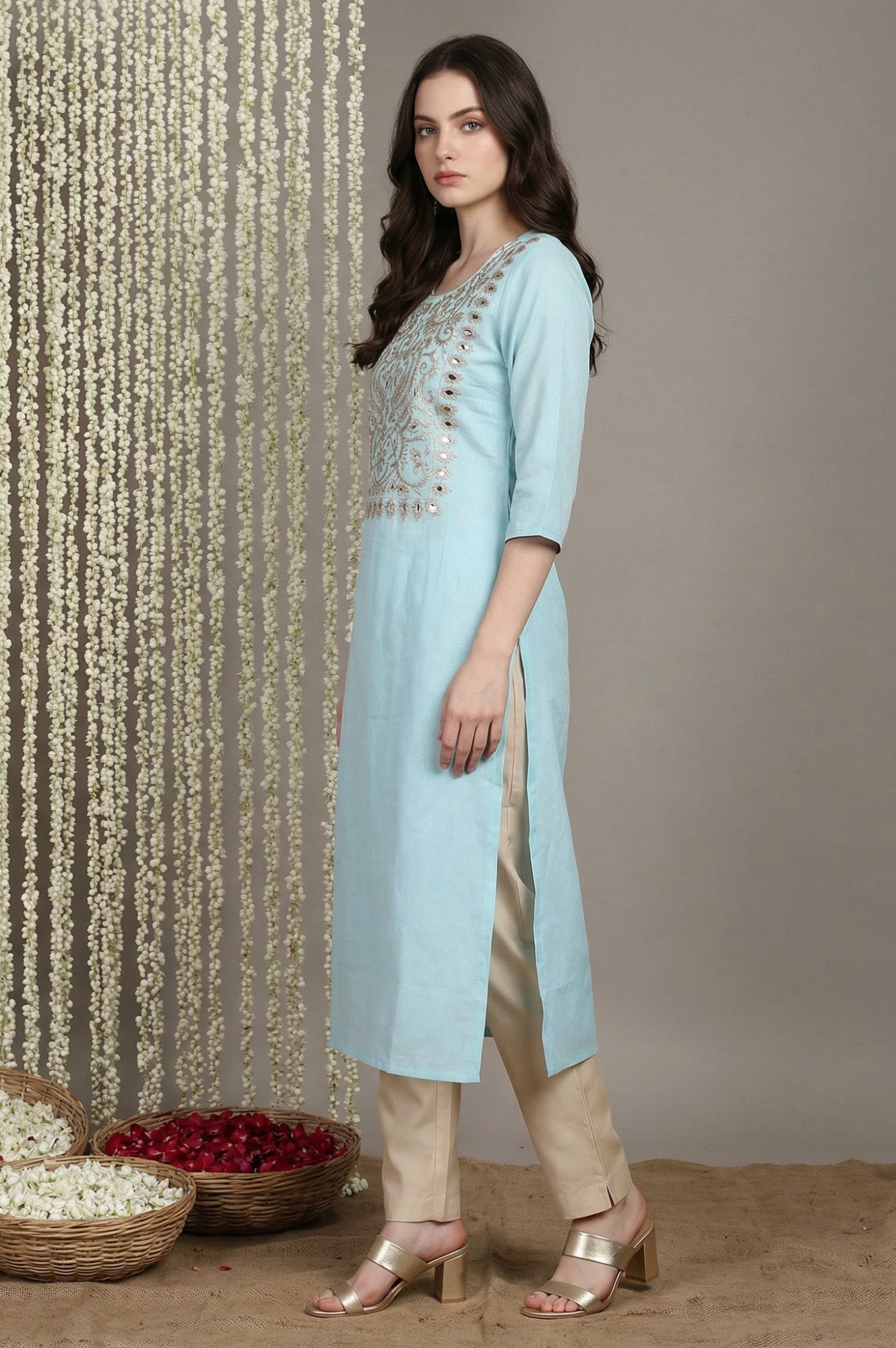 A serene light blue kurta adorned with intricate embroidery and mirror work, this straight-cut piece is perfect for festive occasions or casual gatherings. The breathable cotton fabric ensures comfort, while the three-quarter sleeves and round neckline add a touch of elegance. Pair it with beige trousers for a complete look.