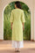 Embrace contemporary ethnic style with this lime green viscose kurta from Aurelia. The kurta showcases a subtle chevron woven texture enhanced by intricate white thread embroidery along the yoke and front. Cut in a classic straight silhouette with a round neckline and three-quarter sleeves, it ensures all-day comfort. Ideal for office or casual wear, style it with contrasting white bottoms for a fresh look.