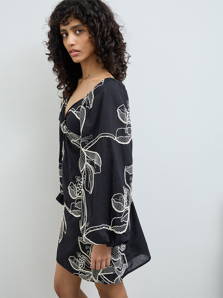 LOV Black Floral Embroidered Cotton A-Line Dress