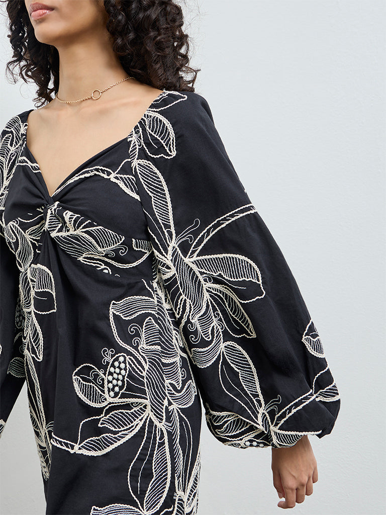 This black cotton A-line dress from LOV features a plunging V neckline and floral embroidery. Designed with puffed puff sleeves, it showcases underbust stitch detailing and a ruched center knot for a sleek fit. The fabric falls gradually into an A-line tapestry, creating a relaxed, knee-length silhouette with full sleeves that add volume and depth.