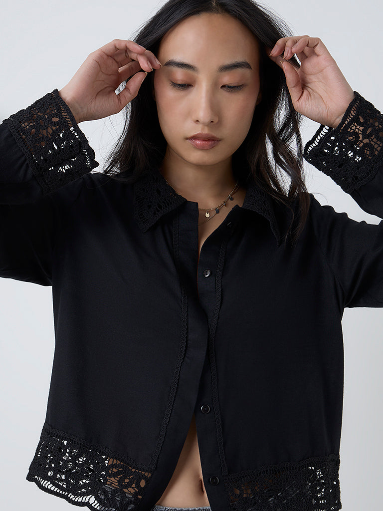For the days you want to feel polished with just a hint of romance, this black shirt from LOV is the one to reach for. Crafted from premium fabric, it features a crisp collar paired with delicate lace trim at the cuffs and hemline. With its full sleeves and sleek finish, it is effortlessly feminine and endlessly versatile.