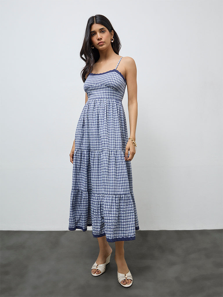 Unwind in understated charm with this navy dress by LOV shaped in a tiered silhouette and finished with classic checkered prints. Spun from a sumptuous cotton-rich fabric, it features a lace-trimmed square neckline and adjustable shoulder straps perfect for relaxed afternoons that drift into evening plans.