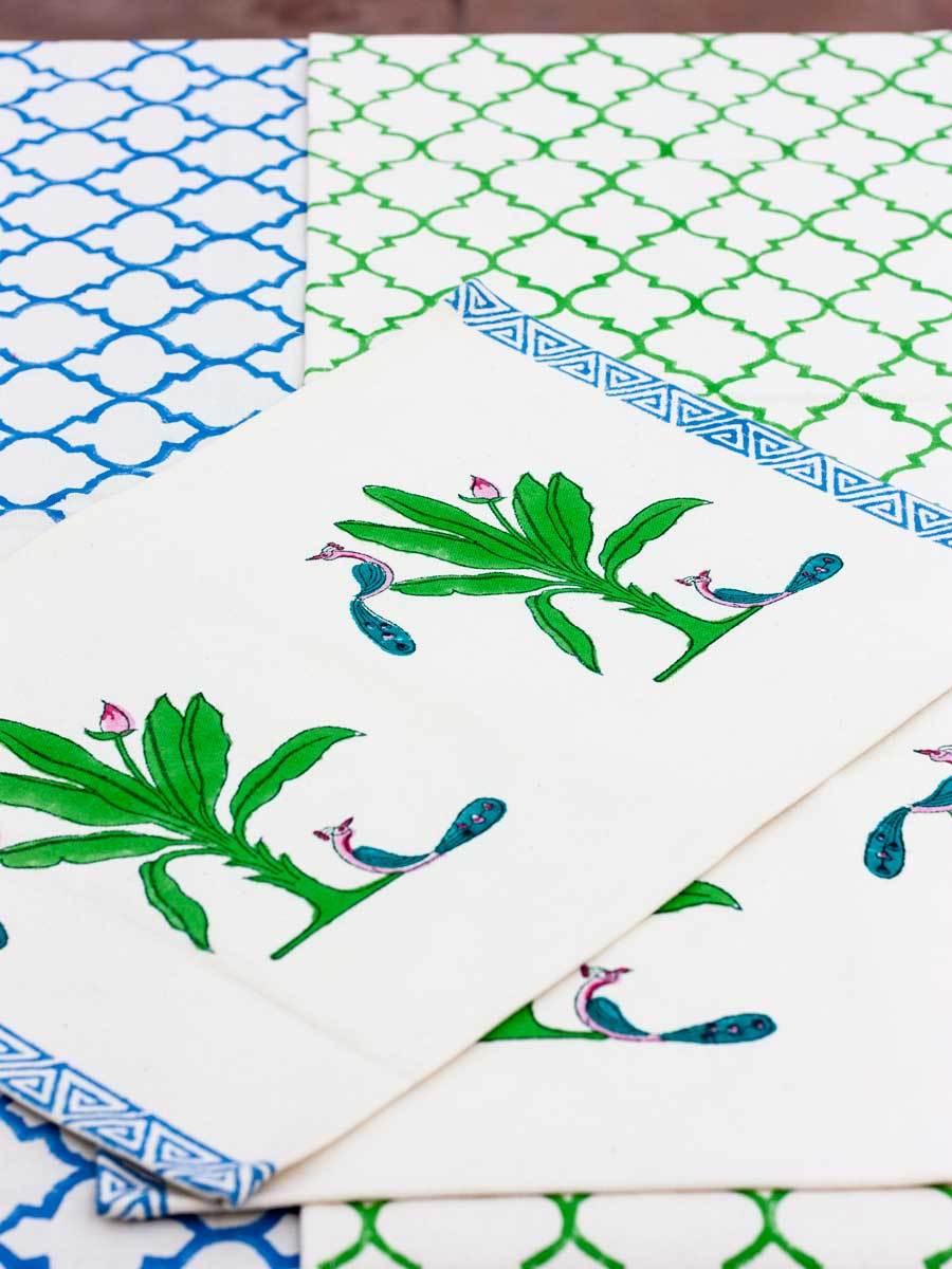 A set hand block print table mats on cotton canvas in our signature design. Make a set with our matching selection of table cloth, table runner, table napkins, tea cozy, and more.