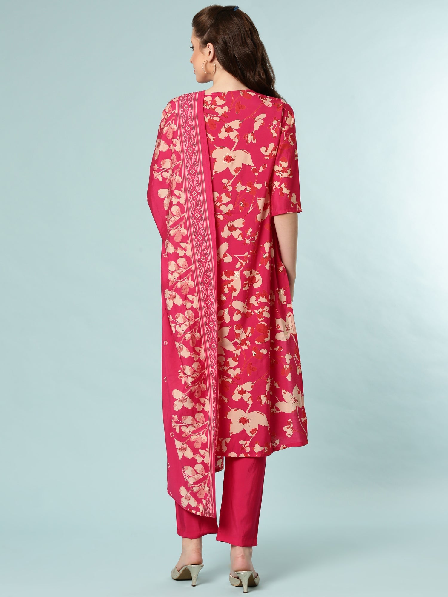 Elevate your ethnic wardrobe with this stunning magenta three-piece set crafted from luxurious dola silk. The vibrant digital print adds contemporary flair to traditional styling, making it perfect for festive occasions, celebrations, or everyday elegance. This versatile ensemble combines comfort with sophistication, allowing you to express your personal style with confidence. The rich magenta hue complements various skin tones beautifully, while the premium silk fabric ensures a graceful drape and lasting quality. Ideal for those who appreciate the perfect blend of modern design and timeless tradition.