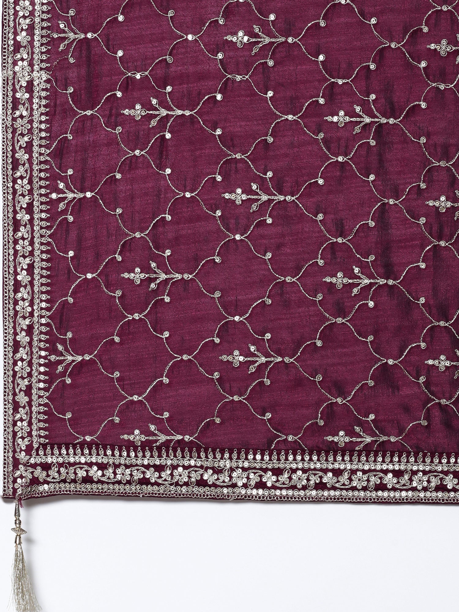 This magenta silk embroidered three-piece Anarkali set showcases expert craftsmanship with its luxurious silk fabric and detailed embroidery. The flowing Anarkali design provides an elegant silhouette, complemented by matching pieces that enhance its traditional appeal. Ideal for formal events and festive occasions, this ensemble offers both sophistication and comfort, ensuring a refined and memorable look.