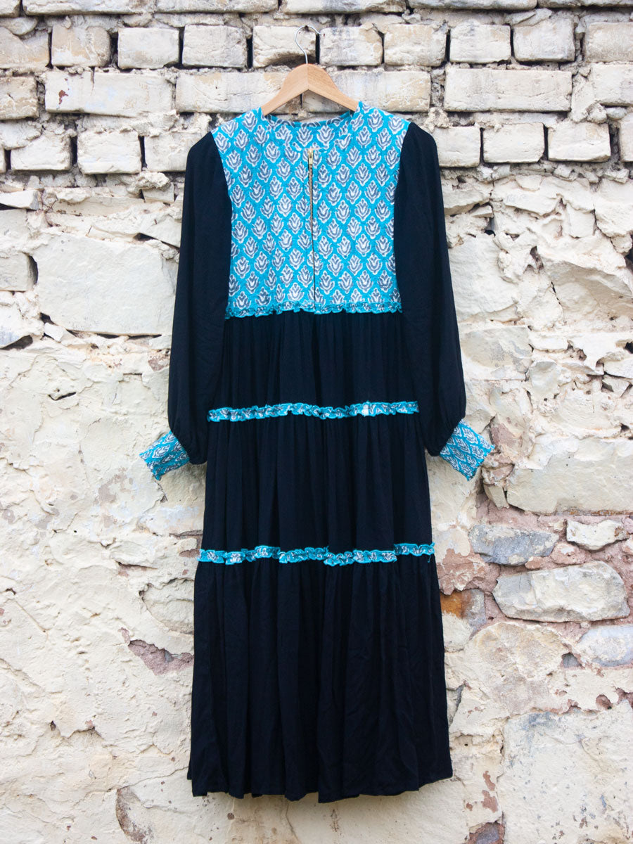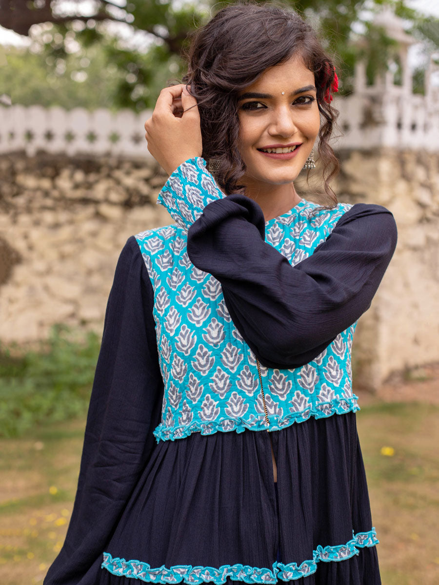 The bodice of this garment is hand block printed and quilted on finest cotton, tiered bottom and sleeves are crafted in viscose with detailing. The sizes mentioned are garment sizes. Our model is 5'6" and is wearing XS size.