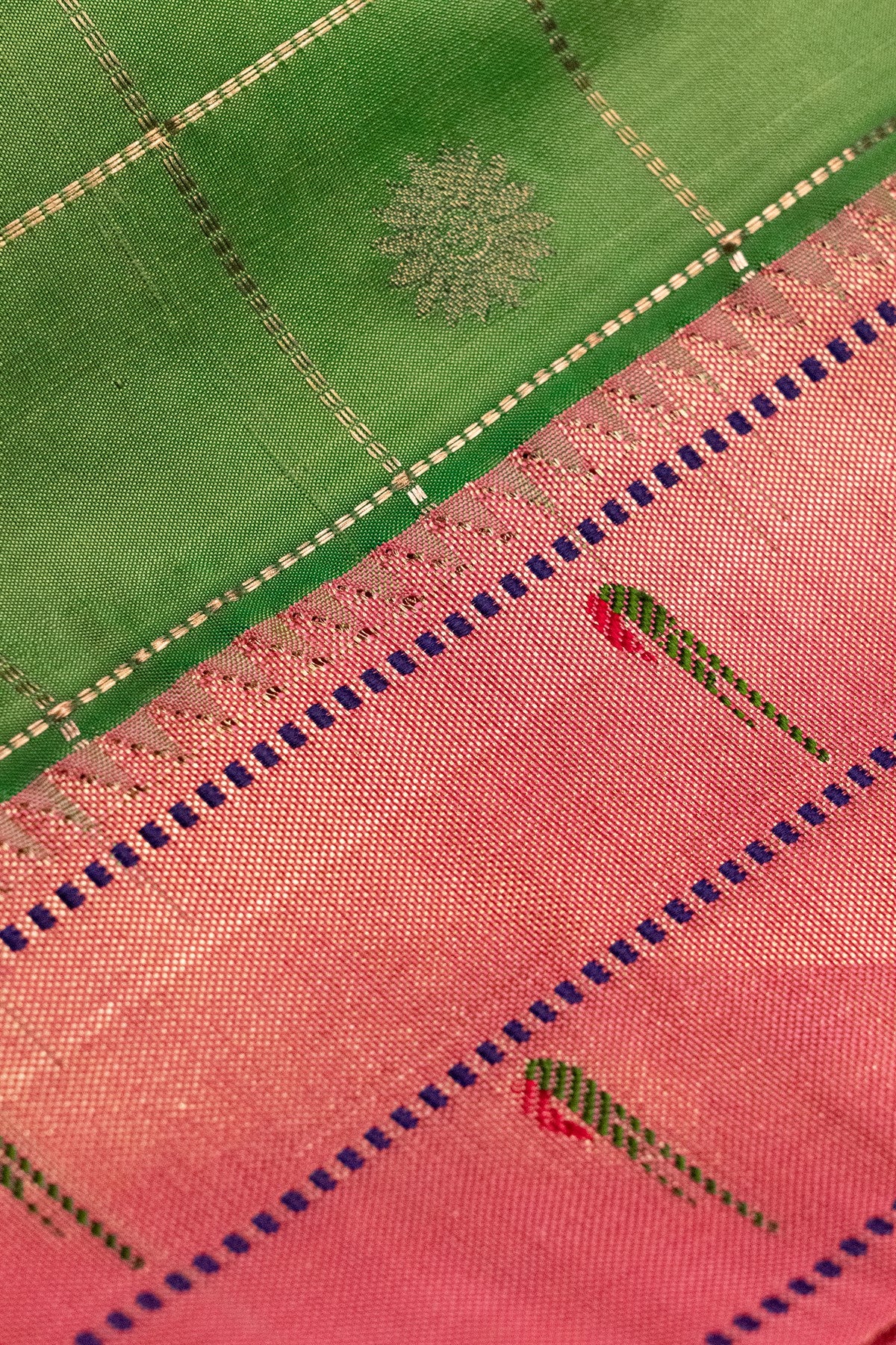 Mandir Green & Peach Pink Paithani Checks And Buttis Saree