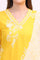 This radiant mango yellow printed A-line kurta is a perfect blend of elegance and comfort. Designed with a flattering V-neckline, it features a refreshing floral print, beautifully enhanced with delicate lace accents for a touch of femininity. The side slits add ease of movement, making it both stylish and practical. Paired with printed parallel pants featuring sheer inserts for a contemporary touch, the ensemble is completed with a printed organza drape adorned with intricate lace edging. Perfect for festive gatherings, summer celebrations, or daytime events, this set offers a breezy yet sophisticated look. Style it with minimal jewelry and elegant footwear for a refined finish.