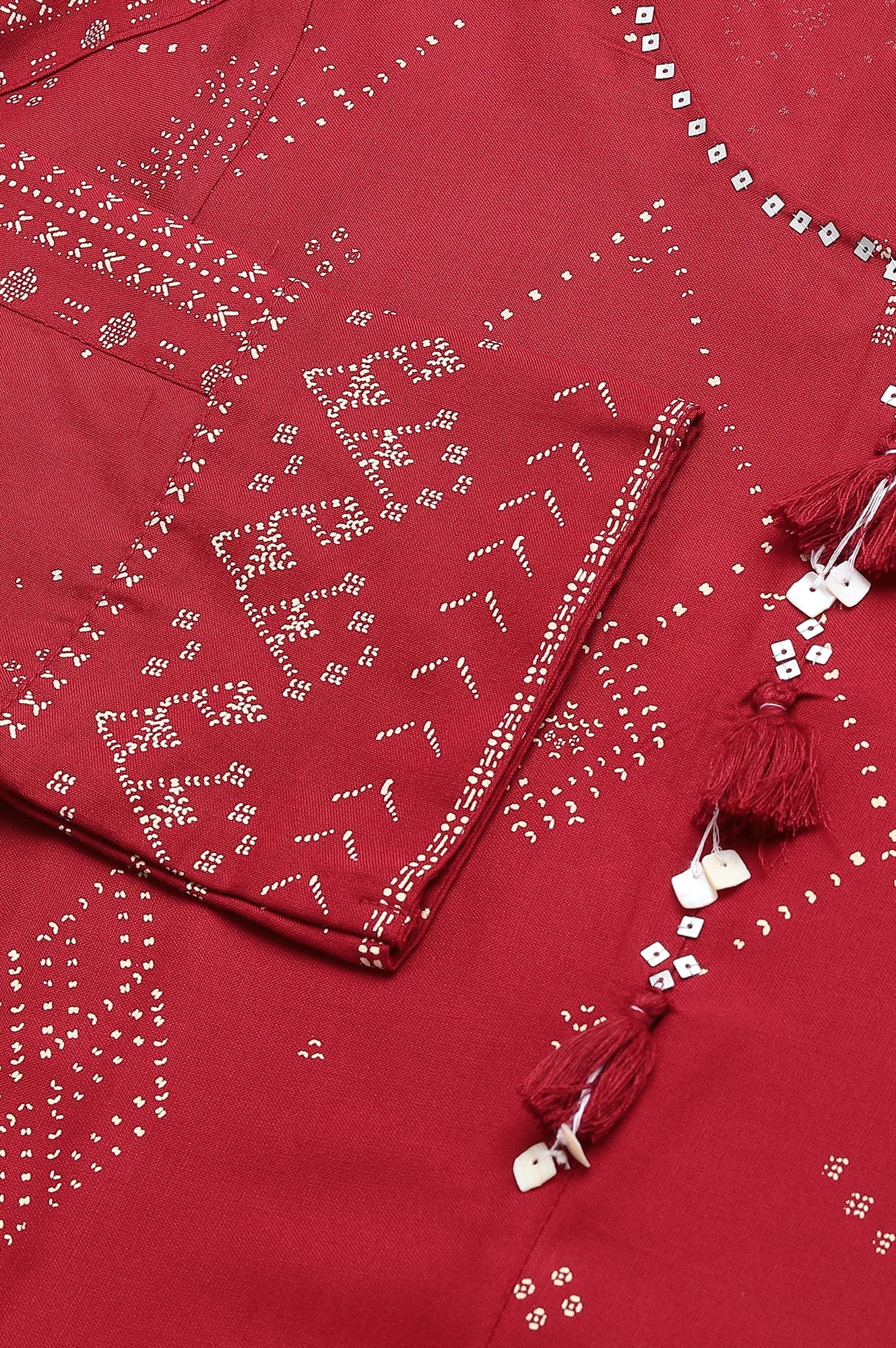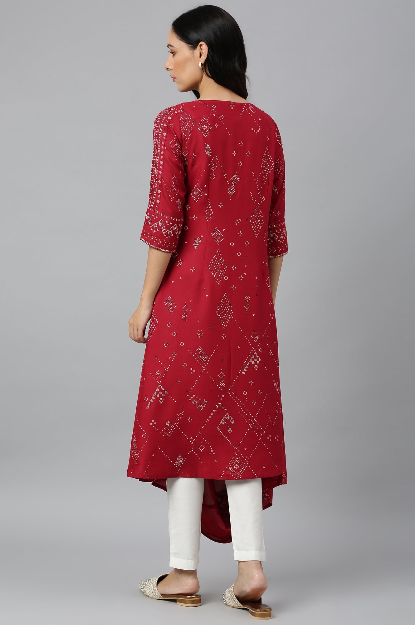 Make a bold statement with this striking red A-line kurta, designed for casual wear. This ethnic piece features a beautiful geometric print that adds a contemporary twist to traditional design. Crafted from 100% viscose, the kurta offers a soft, flowing feel that's perfect for all-day comfort. The three-quarter sleeves and round neckline contribute to its classic yet modern appeal. The A-line silhouette is flattering for various body types, providing a graceful and elegant look. The use of rayon fabric ensures a luxurious drape and a smooth texture against the skin. This woven garment is perfect for those who appreciate the fusion of traditional and modern elements in their ethnic wear. Whether you're attending a casual gathering or simply want to add a touch of elegance to your everyday look, this kurta is an excellent choice. Its vibrant red color and intricate geometric pattern make it a standout piece in any wardrobe.