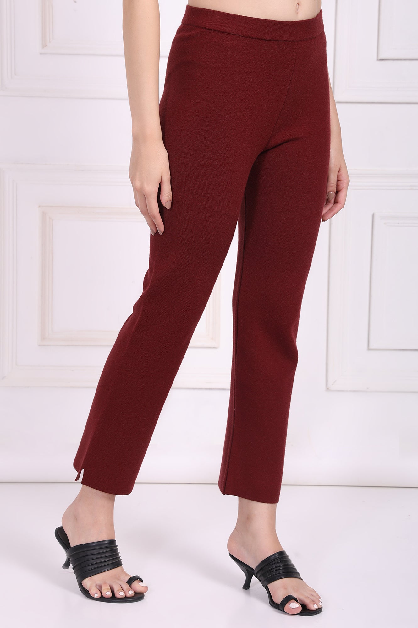 A masterclass in minimalist design, these Deep Garnet trousers for women redefine everyday elegance. Crafted for the modern woman who values both style and comfort, their sleek silhouette offers a foundational piece for countless looks, from the office to an evening out. You’ll find these are the ladies' pants you reach for time and again. They feature a comfortable mid-rise cut that sits perfectly on the waist, flowing into a clean straight-fit leg that provides a universally flattering profile. The design prioritizes ease and a seamless look; a smooth, fully elasticated waistband makes them effortless pull-on trousers, eliminating any bulk from zippers or buttons. A pristine flat front maintains the clean, sophisticated lines, while the pocketless construction further enhances the streamlined silhouette. Cut to a contemporary ankle-length, these versatile knit pants are finished with a subtle side slit at the hem, a thoughtful detail that adds a hint of modern flair and ease of movement. The fabric drapes beautifully and feels exceptionally smooth against the skin, offering the perfect blend of structure and stretch for comfort that lasts all day long. Pair these indispensable maroon straight-leg trousers with a crisp white shirt for a sharp, formal look or a vibrant, printed kurta for a touch of fusion flair.