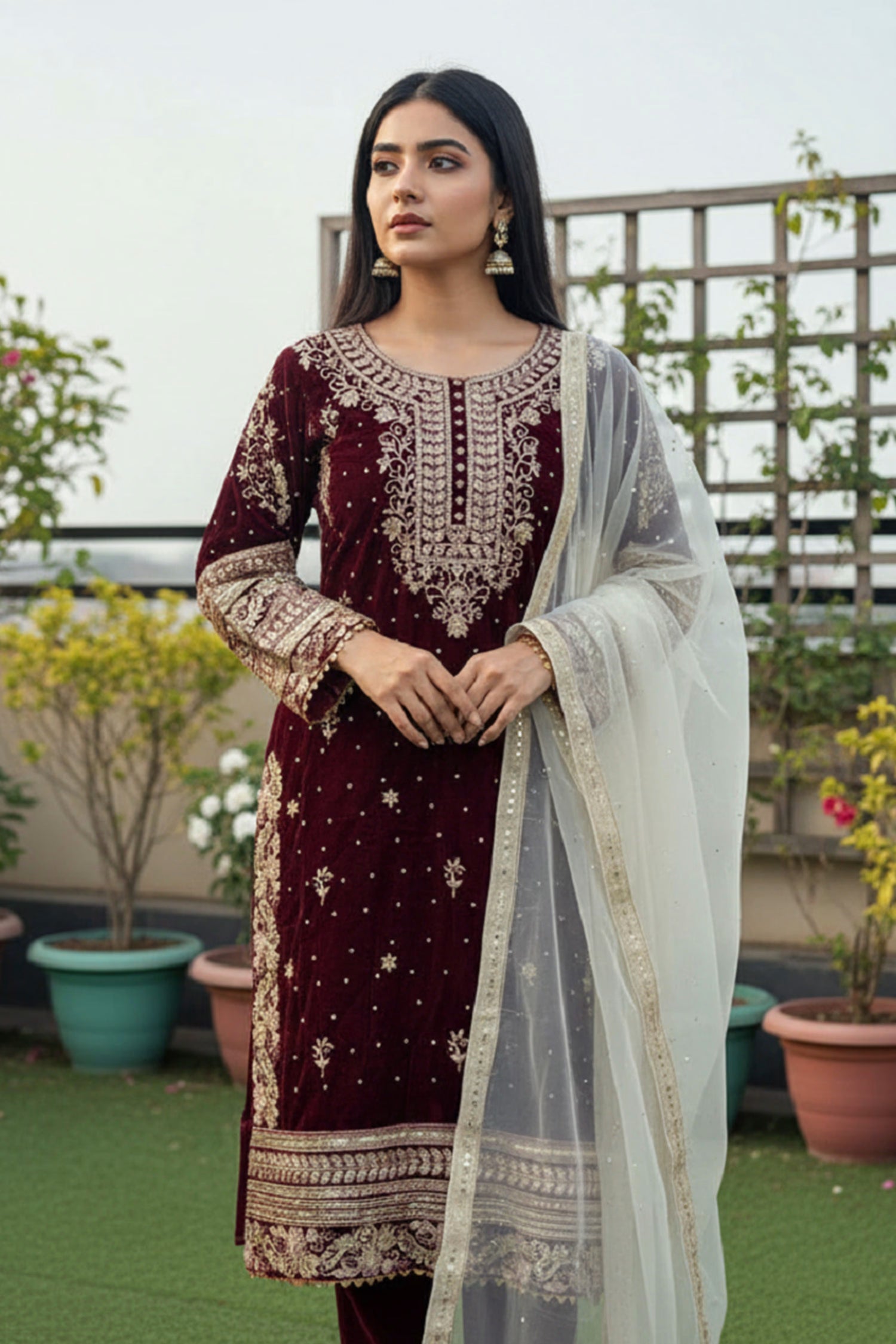 The maroon velvet floral embroidered kurta set with embroidered straight cut kurti matching pant and white dupatta for a rich graceful look with elegance.