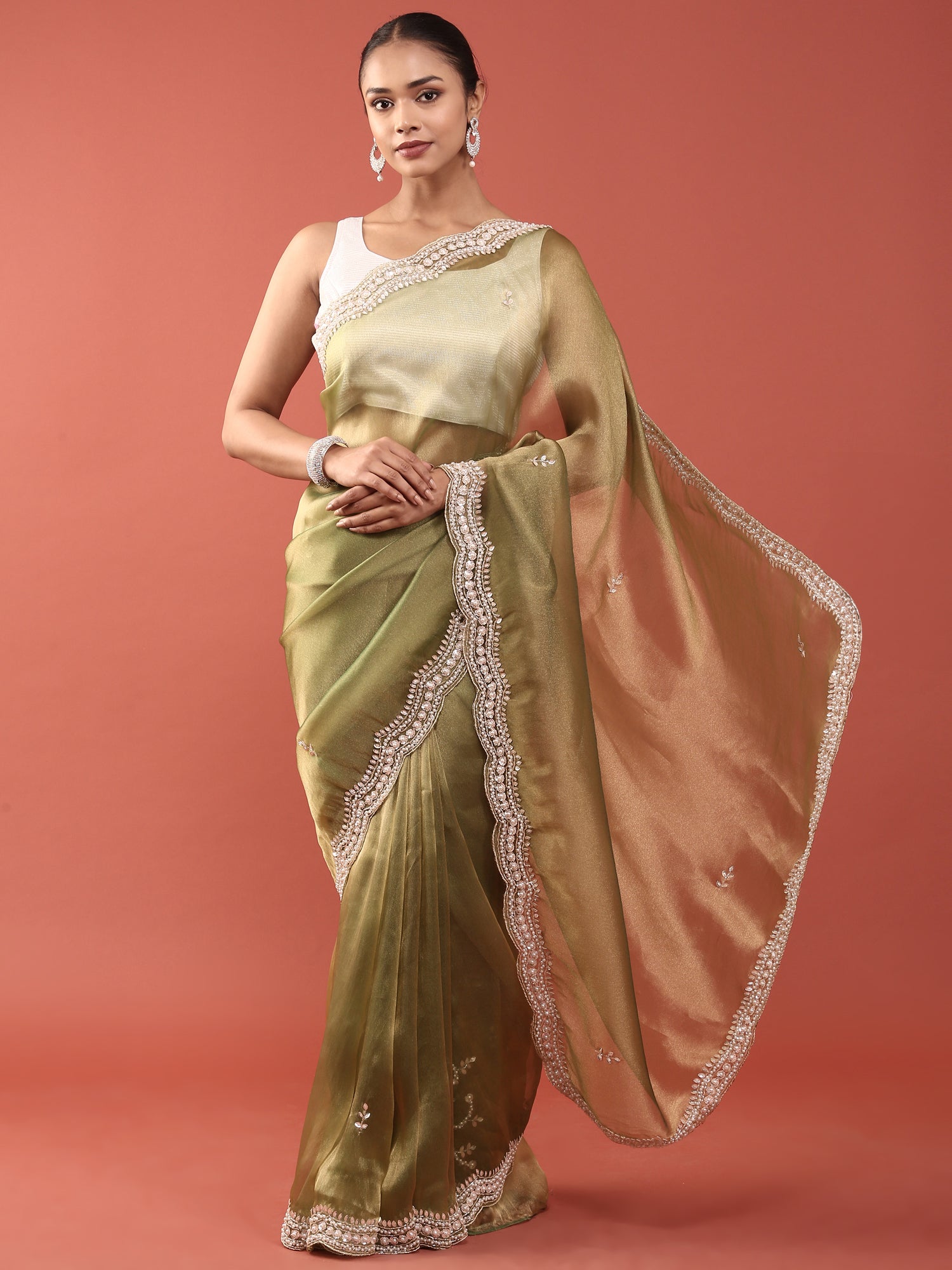Mehadi Green Organza Stone And Thread Embroidery Saree