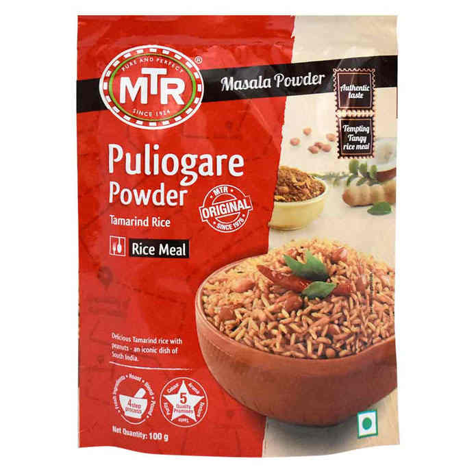 - Some of the choicest ingredients such as Dried Red Chillies, Urad, Channa & Toor Dal are grounded into a fine powder to create this tangy zesty delight. The MTR Puliogare powder contains Tomato Concentrate, Sugar, Dry Coconut, Curry Leaves, Fenugreek, Bengalgram And Blackgram Dal, Salt, Jaggery, Mustard, Asafoetida and Cumin.