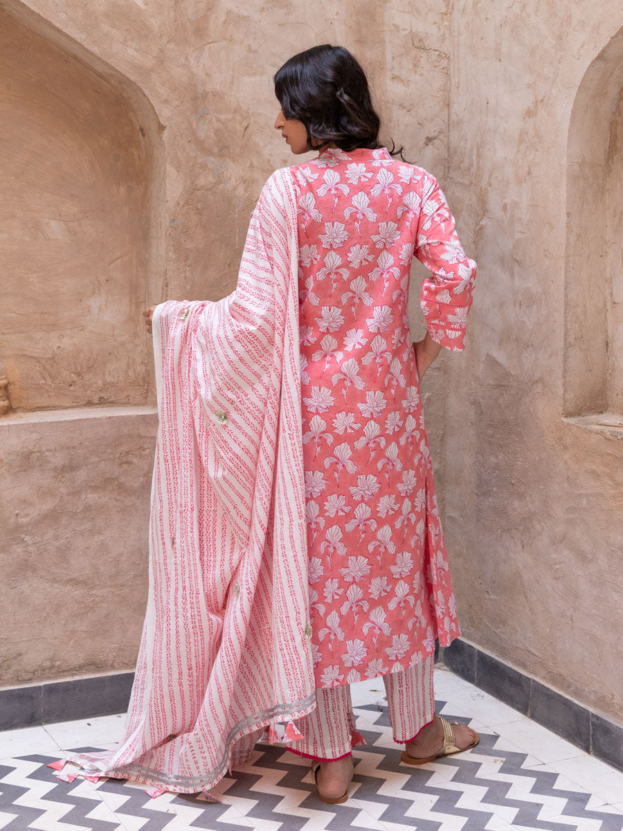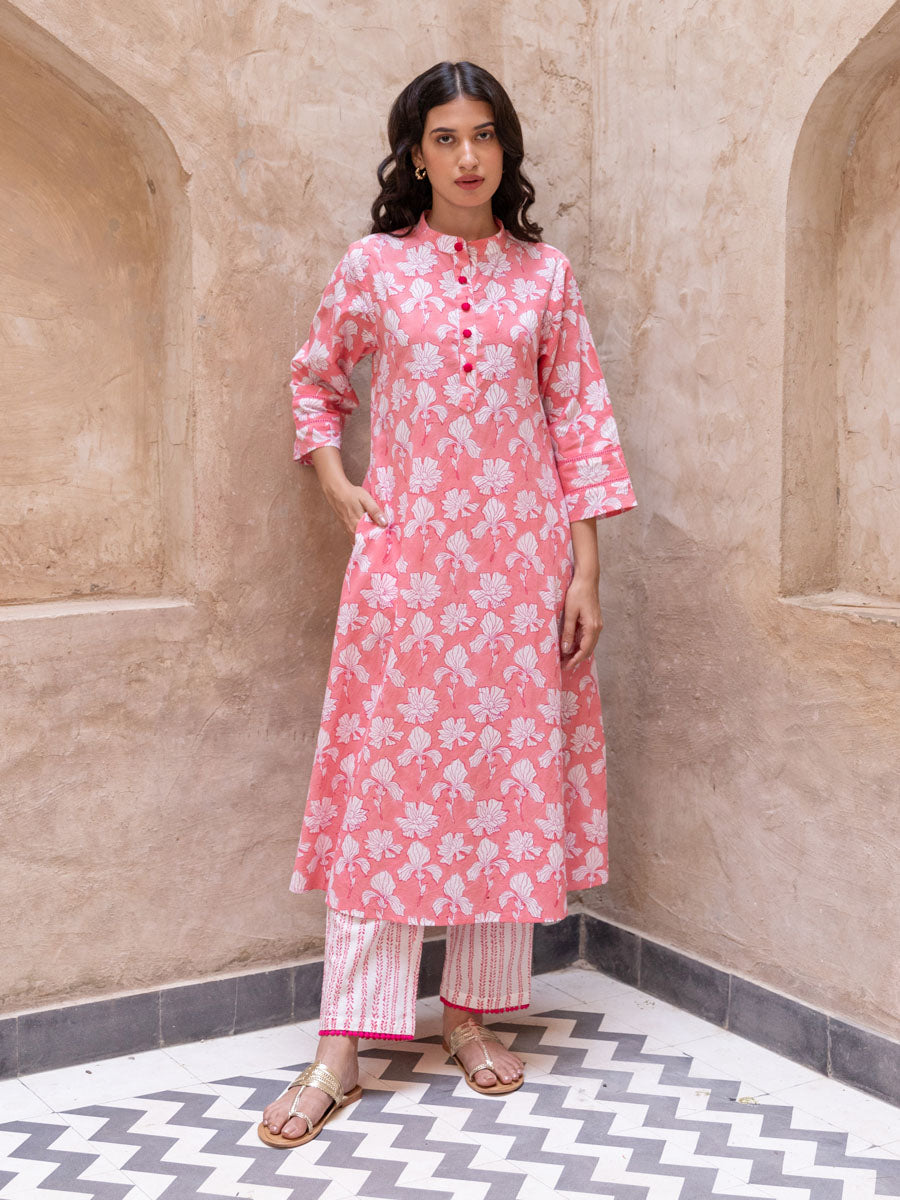 - A-line cotton kurta with pockets, embroidered buttons and ladder lace