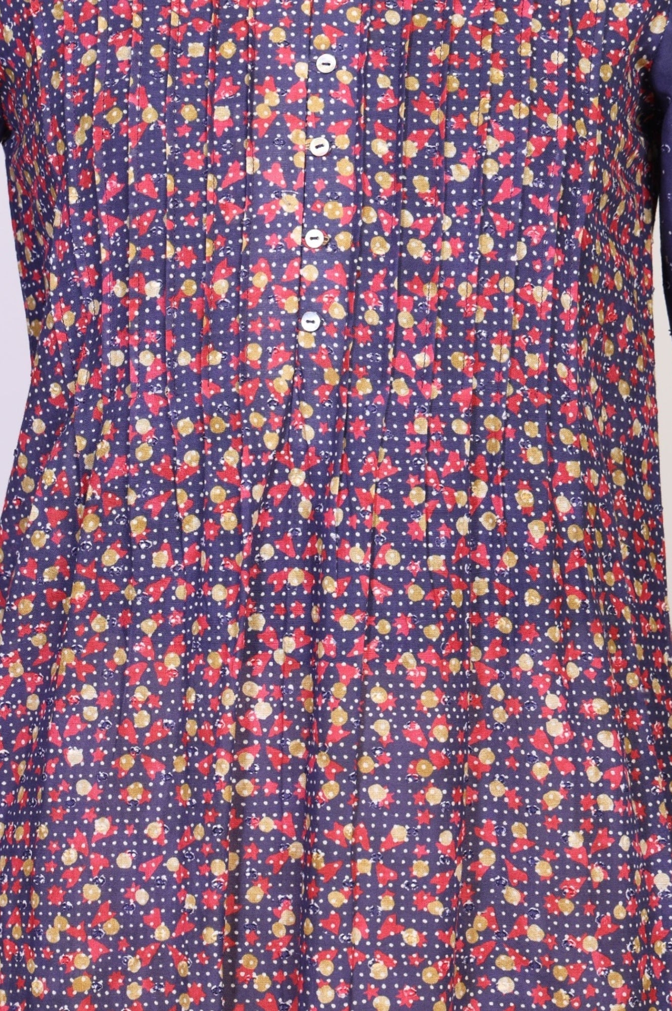 Refresh your daily ethnic wardrobe with this Navy Blue floral printed kurta from Aurelia, crafted from breathable pure cotton for all-day comfort. Designed with a smart mandarin collar and a pintucked yoke, this straight-fit kurta features subtle foil print details that add a hint of shine to the botanical motifs. The three-quarter sleeves and functional button placket enhance its practical appeal, making it an ideal choice for office wear or casual outings. Pair this versatile piece with beige trousers and block heels for a polished, effortless look.