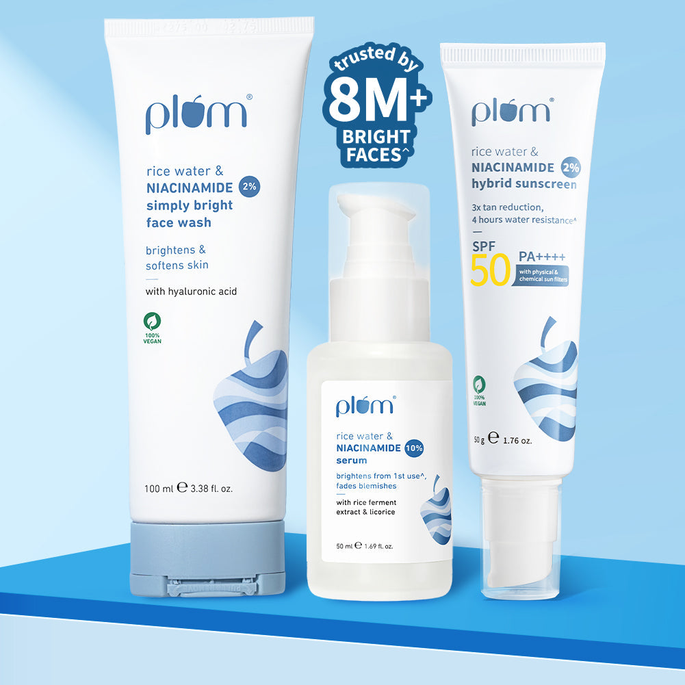 Powered by Niacinamide and Rice Water, this 3-step routine, featuring a face wash, serum, and SPF50 sunscreen gently lifts away impurities, refines pores, hydrates deeply, and shields skin from sun damage. The result? Brighter, smoother, and more even-toned skin. Because clear skin is always a bright idea.