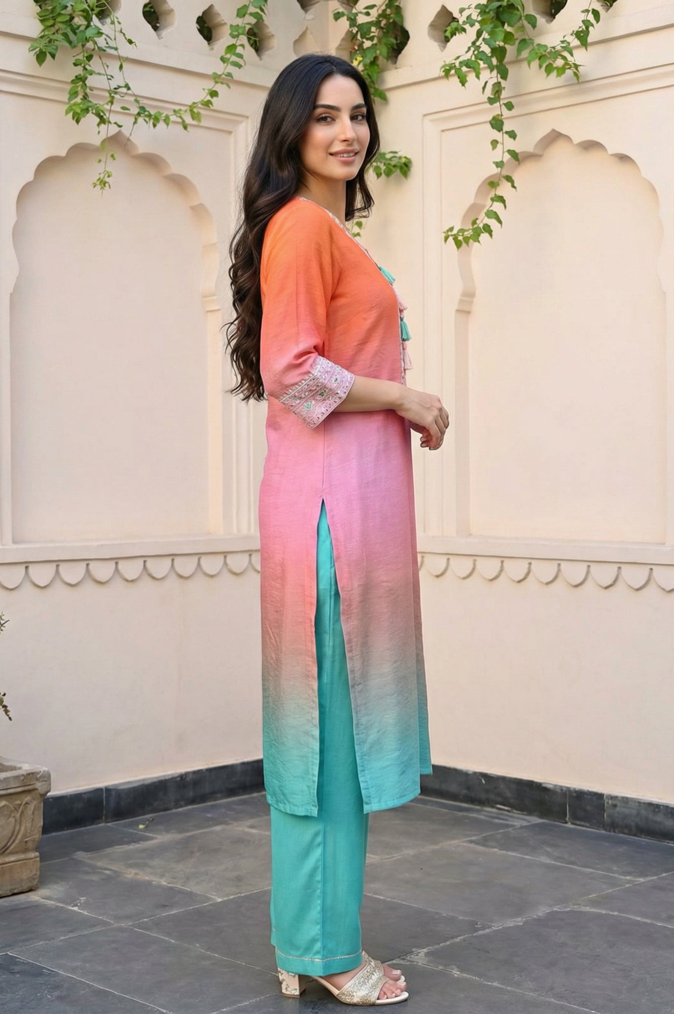 Orange Ombre Embroidered Straight Kurta with Palazzo and Dupatta Set